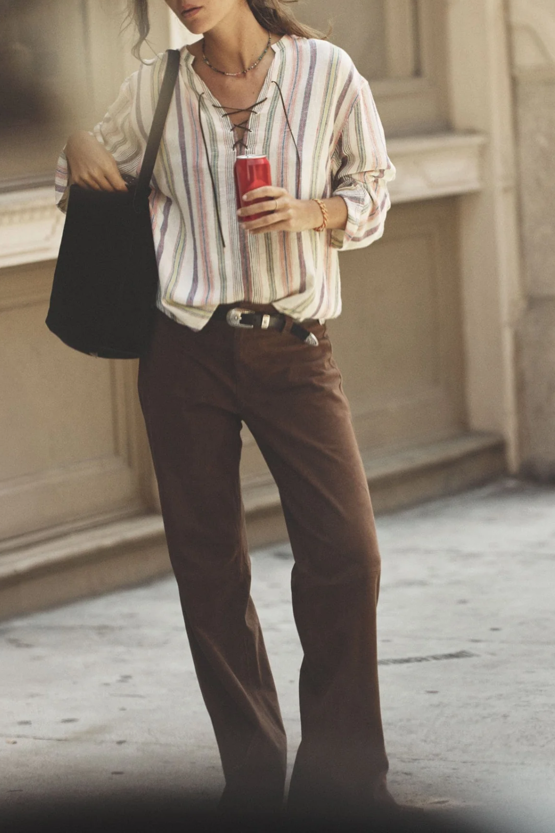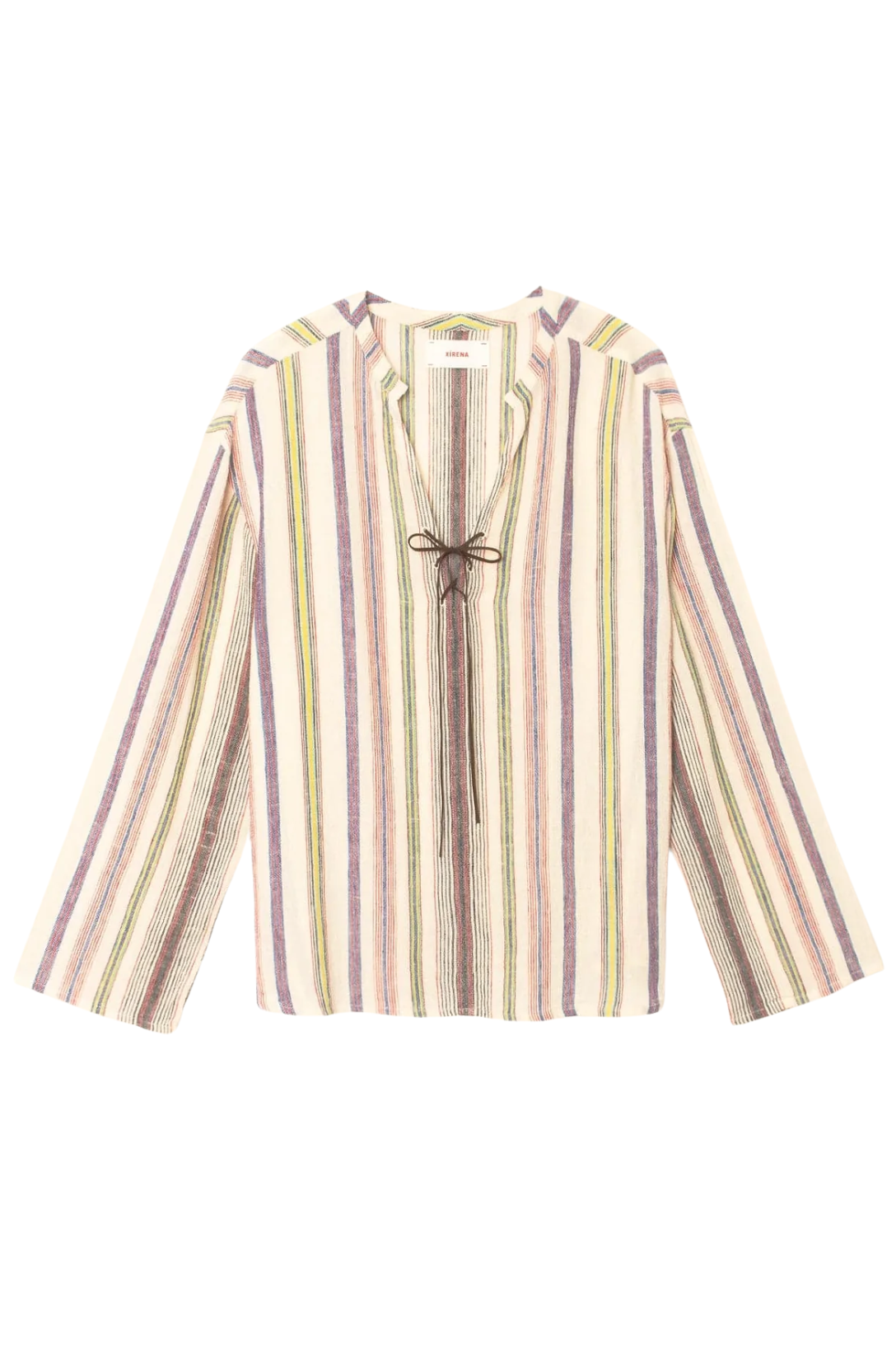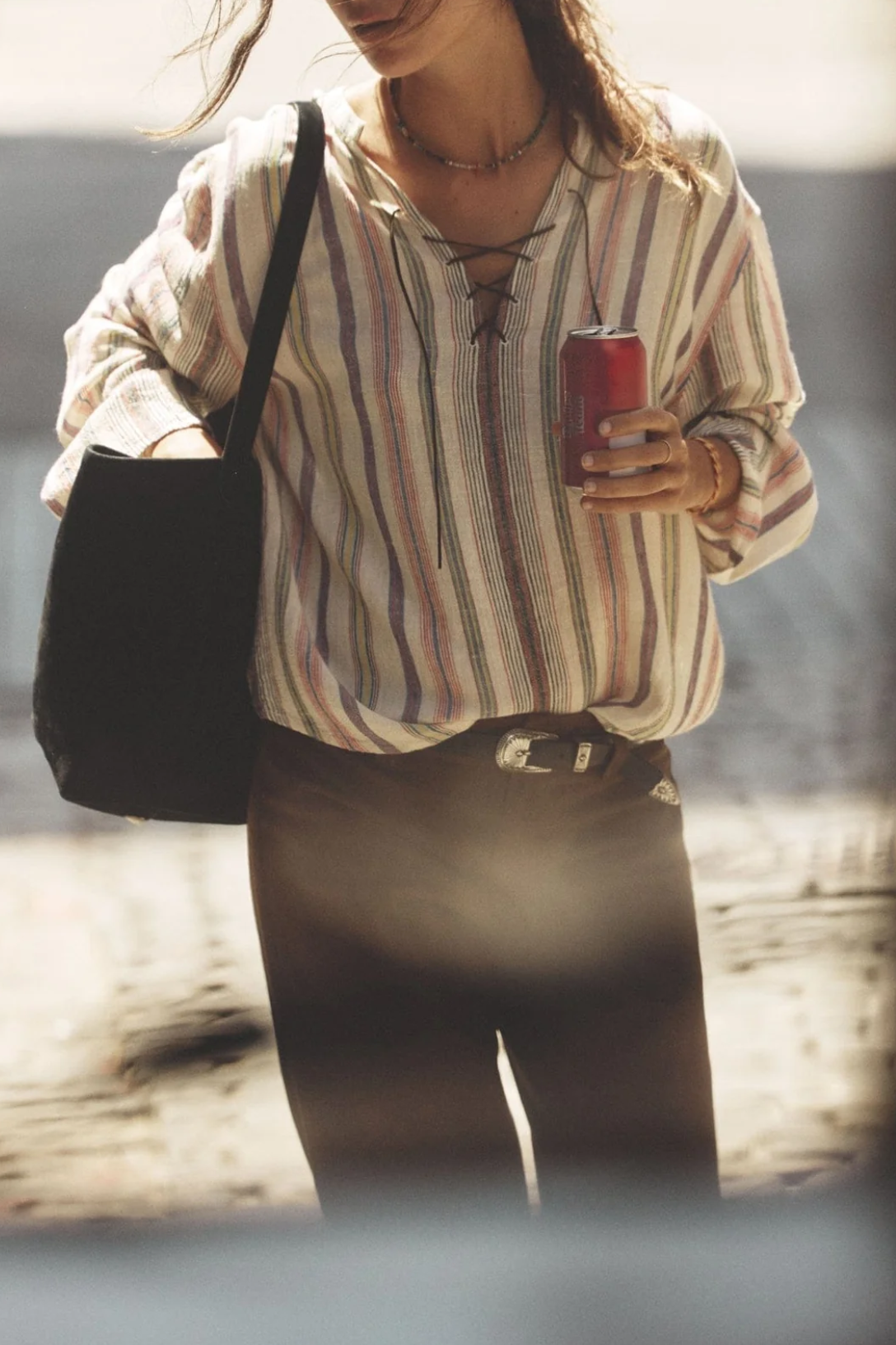 French allure meets California ease. Anais is new this season in XIRENA's colorful viscose stripe. This relaxed blouse features a V-neck, raglan sleeves, and an adjustable suede lace-up for an elevated feel.