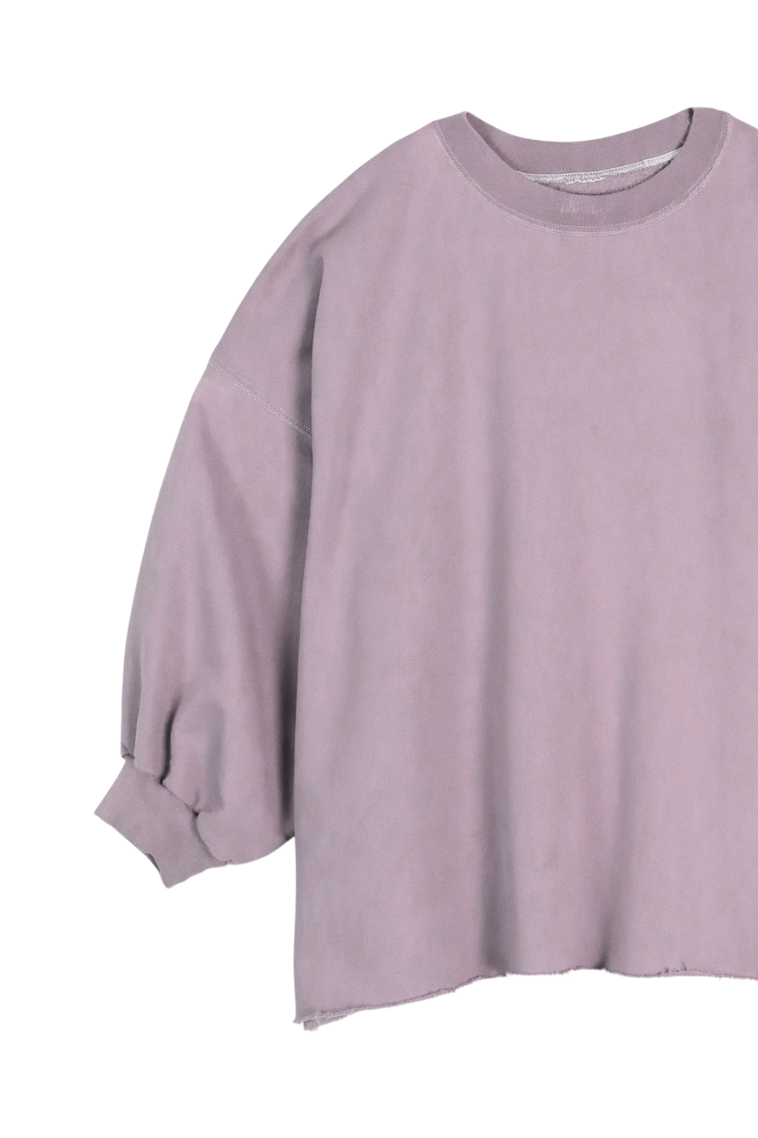 A classic crewneck sweatshirt with drop shoulders, cropped sleeves, a raw edge hemline and unique distressing throughout. Makes a great styling piece for any look.