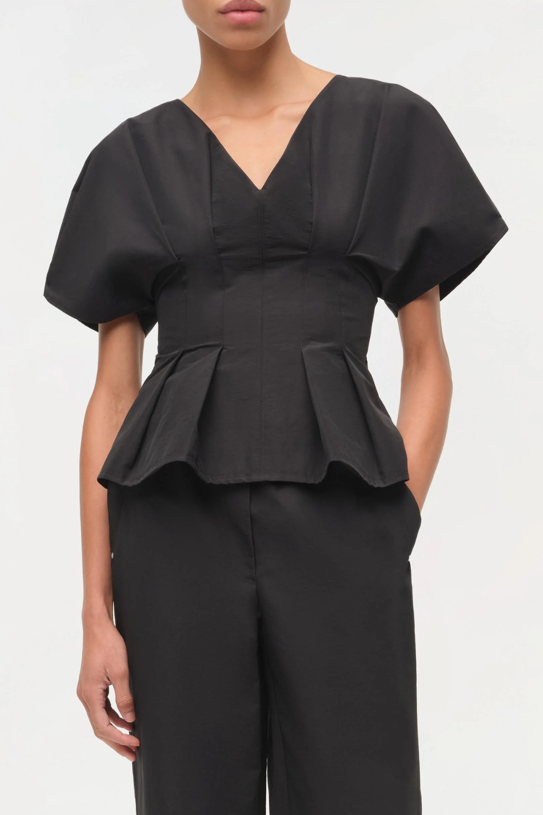 The Rozen Cotton Faille Top in Black. Cut from cotton faille, this peplum top features an open V-neck and finely tailored pintucks that release into structured pleats at the hem. A refined piece with effortless polish for day or night.