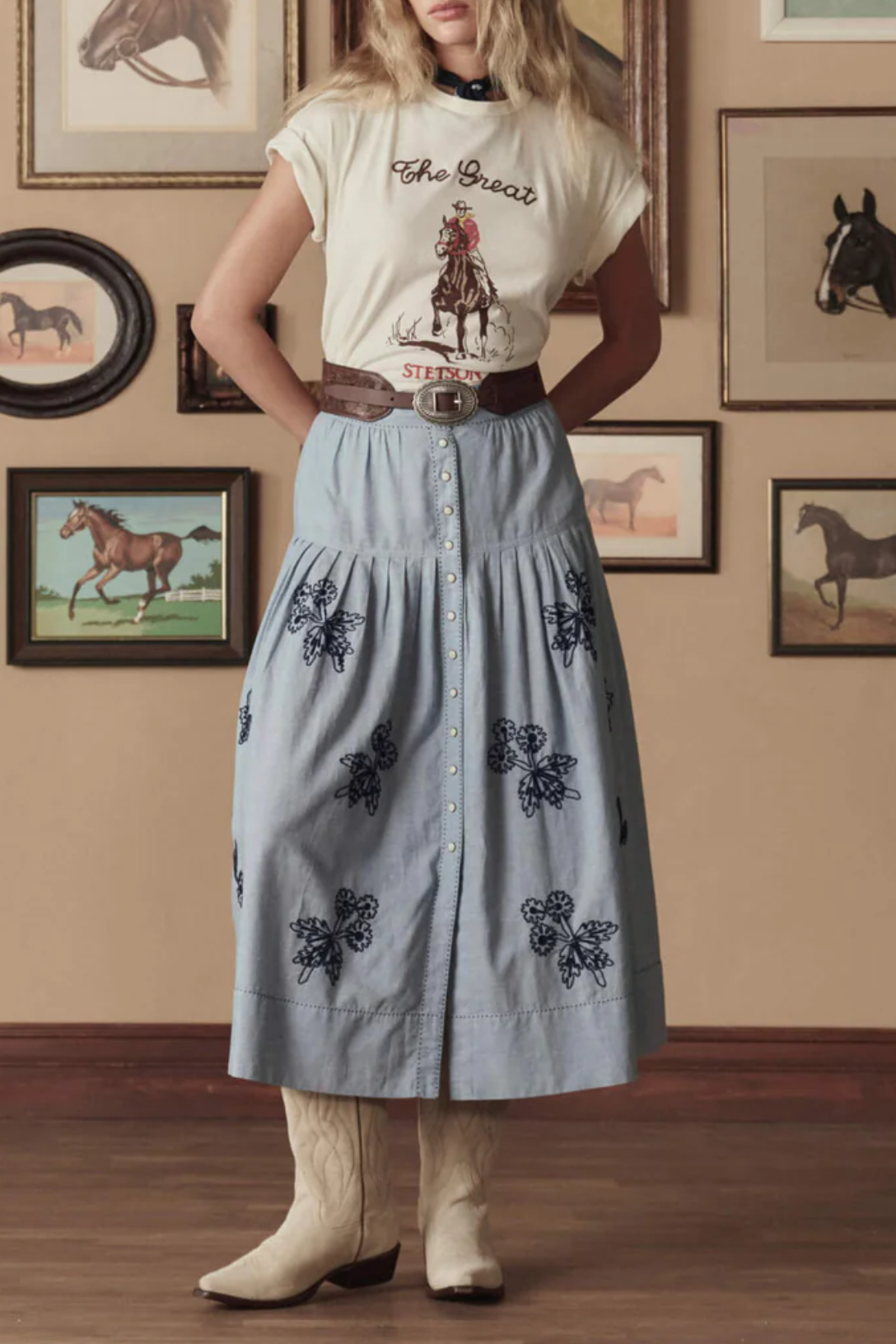 Inspired by a cherished vintage tee, the Boxy Crew is cut generously through the body with flattering updates like angled sleeves and a perfectly balanced length. Designed to become a go-to favorite, this style is made in collaboration with Stetson, whose legacy of authentic craftsmanship has defined the spirit of the West since 1865. It features their signature graphic, printed on soft jersey fabric with a slightly faded application and special embroidered accents that create a perfectly worn-in, vintage feel. Handcrafted locally in Los Angeles, each piece is unique, ensuring no two are alike.