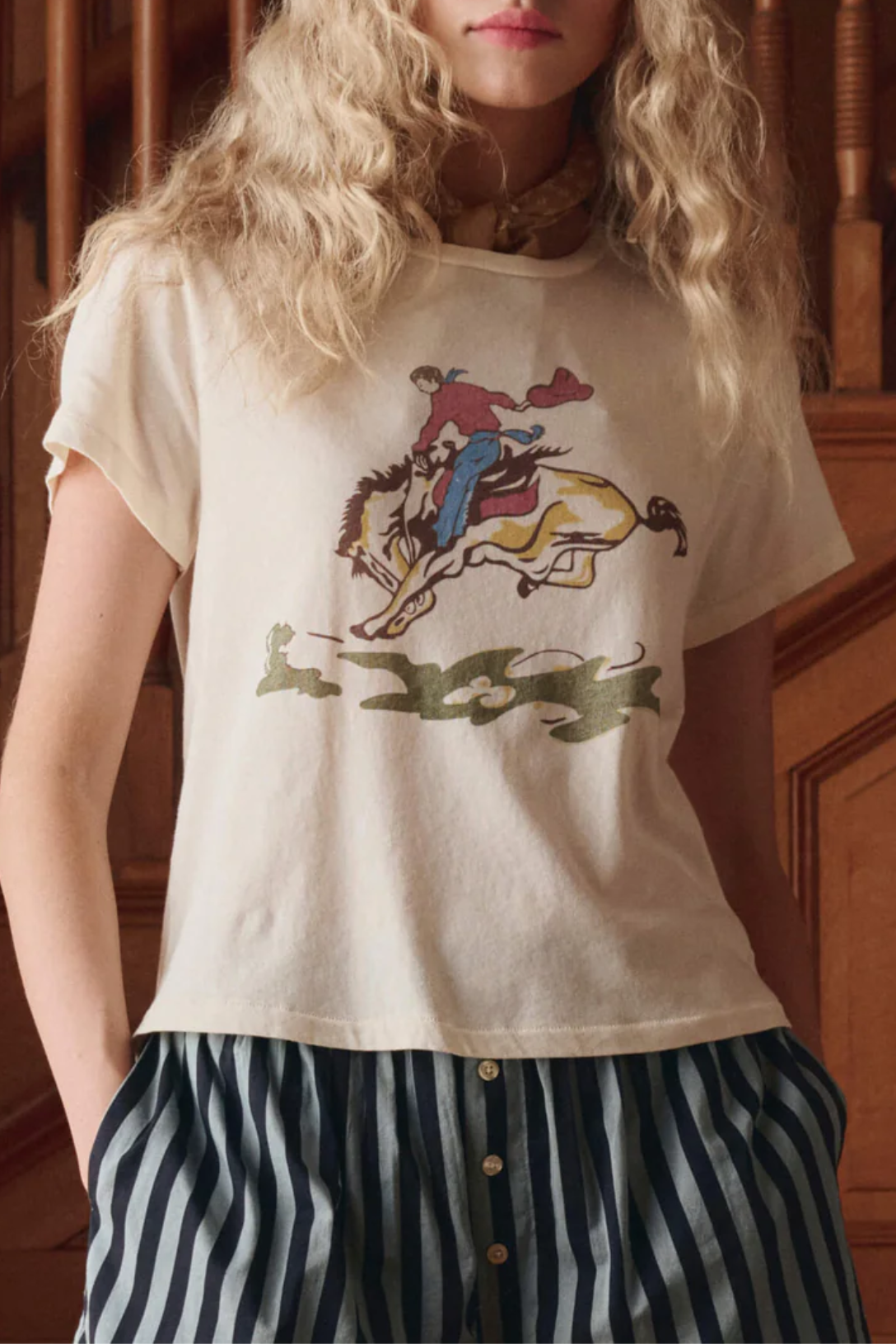 The Little Tee. is inspired by a vintage ‘30s men's undershirt with a super-washed and lived-in feel. This tee is THE GREAT's favorite layering piece—it's close to the body fit makes it easy, comfortable, and perfect for wearing by itself or layered under a sweater. This season, it features The Rider Graphic- inspired by a 1950s little boy's graphic tee. Handcrafted locally in Los Angeles, THE GREAT's process ensures beauty and uniqueness—no two pieces are alike.
