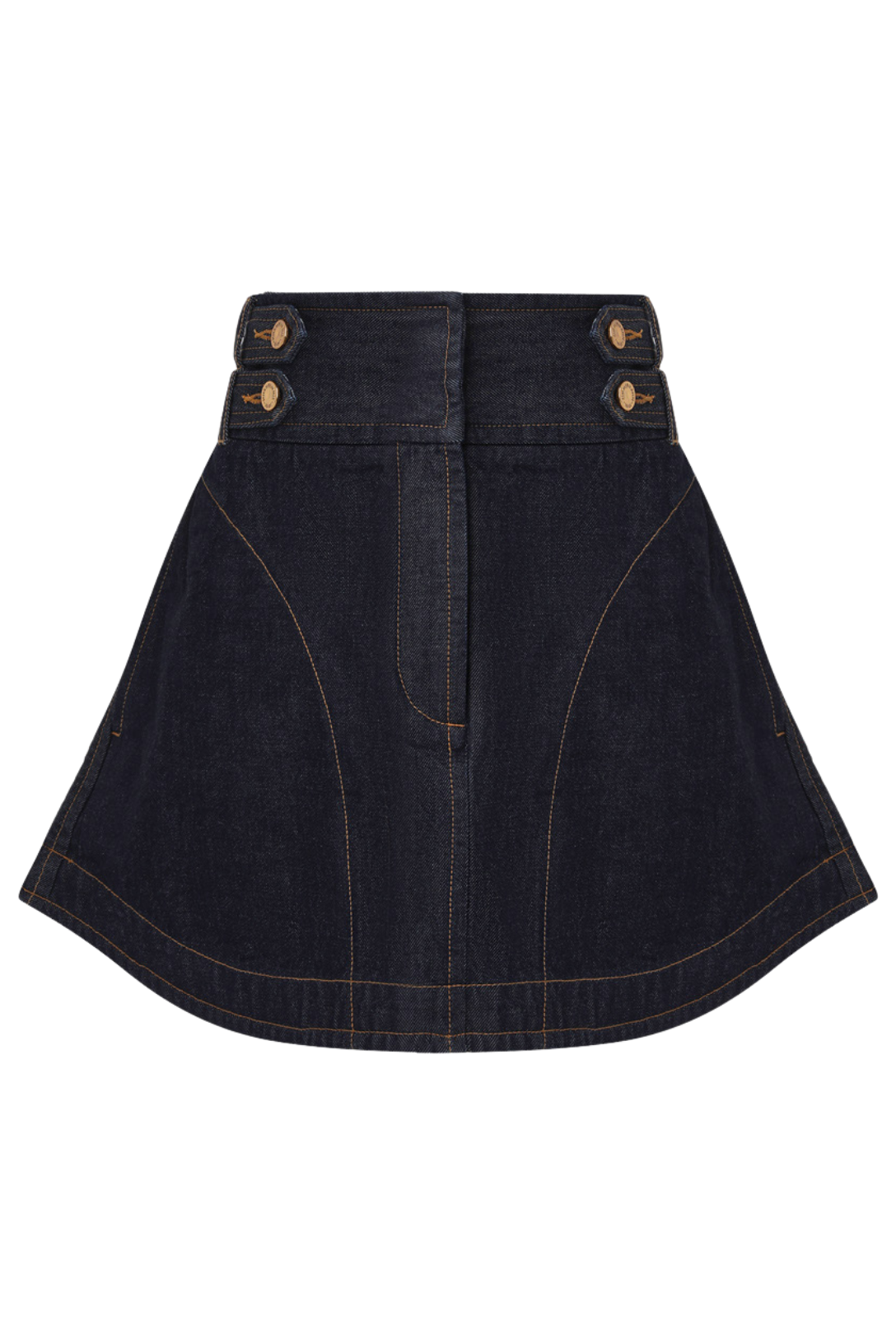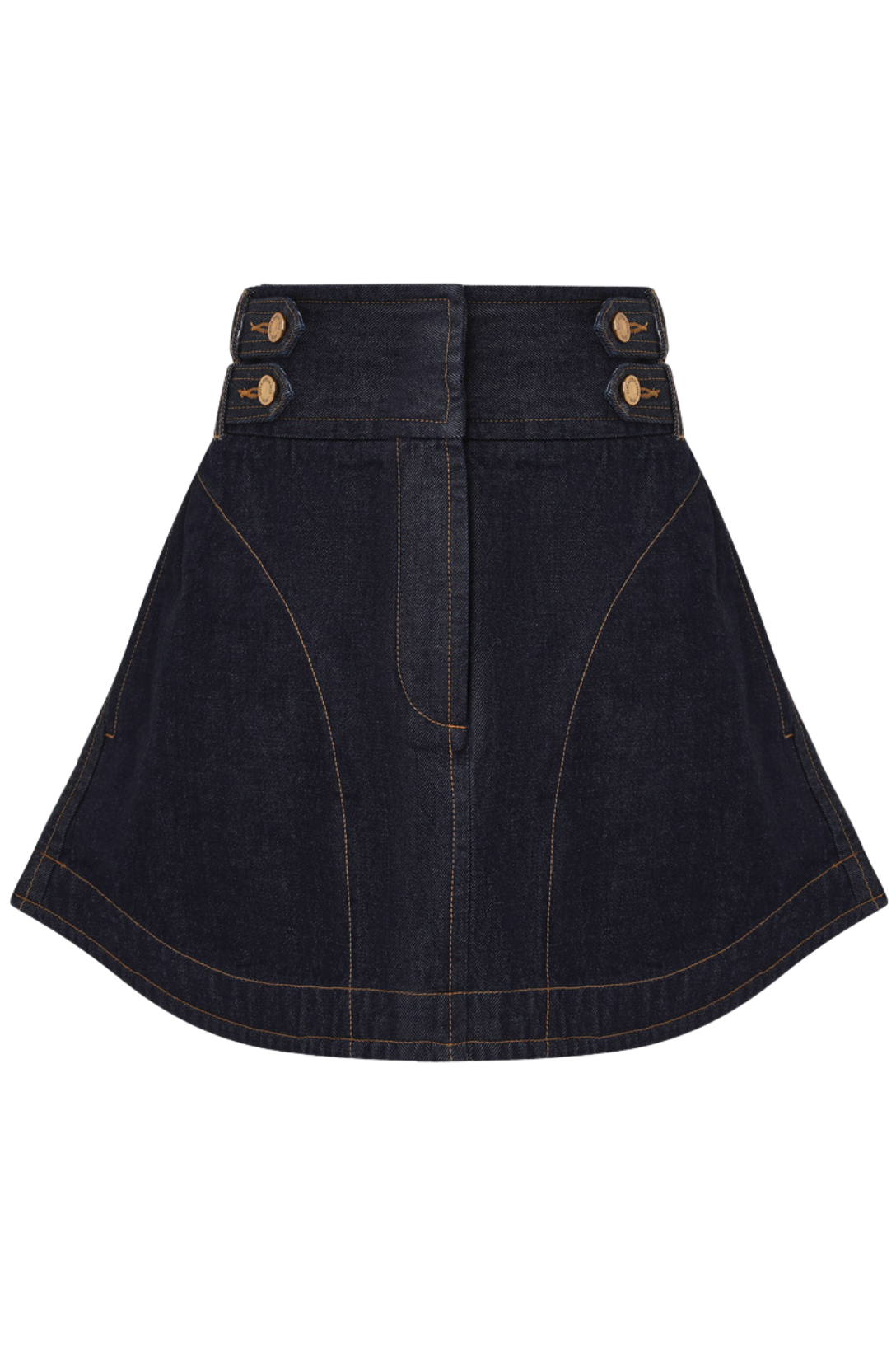 The Denim Cargo Mini Skirt in Night Sky from Zimmermann's Cruise 2026 Collection, Twisted Romance. A denim mini skirt featuring a fitted waistband with bar tabs, gold button detailing, finished with topstitching throughout.