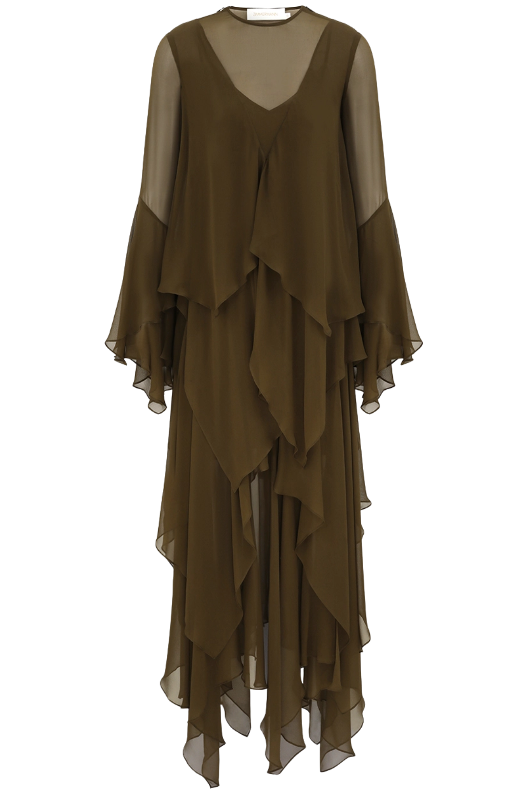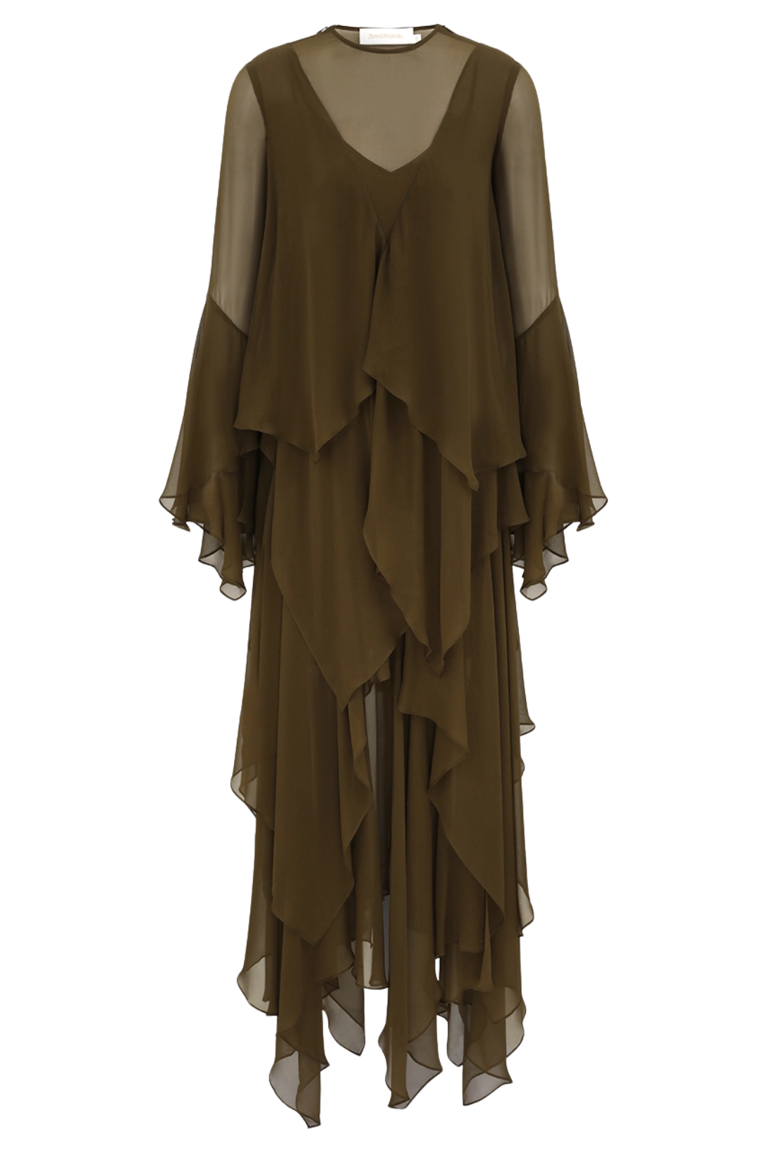 The Memento Cascading Maxi Dress in Moss from Zimmermann's Fall 2025 Collection, Hypnotic. A silk maxi dress featuring a rounded neckline, sheer paneling throughout, finished with cascading frill detailing.