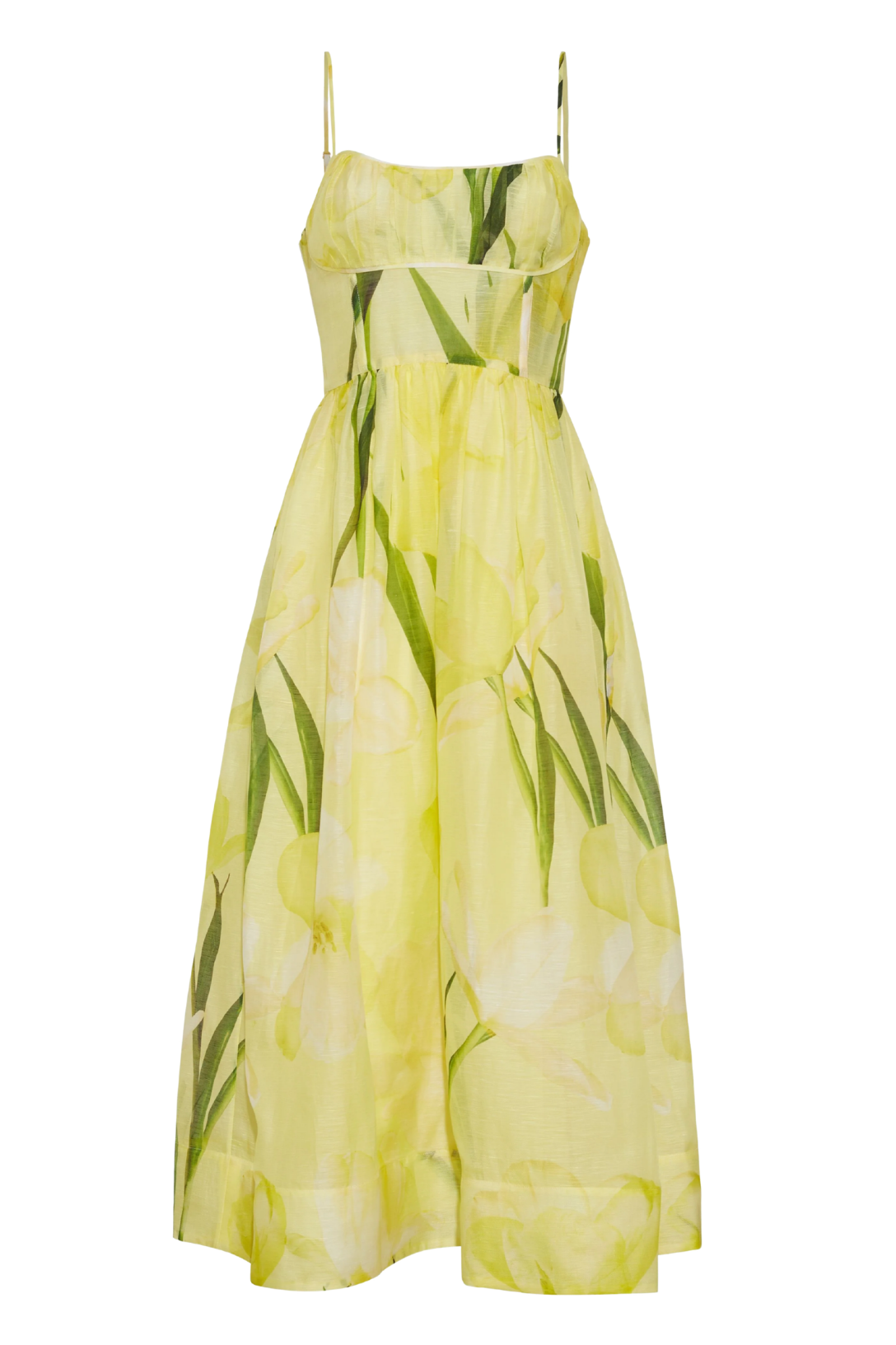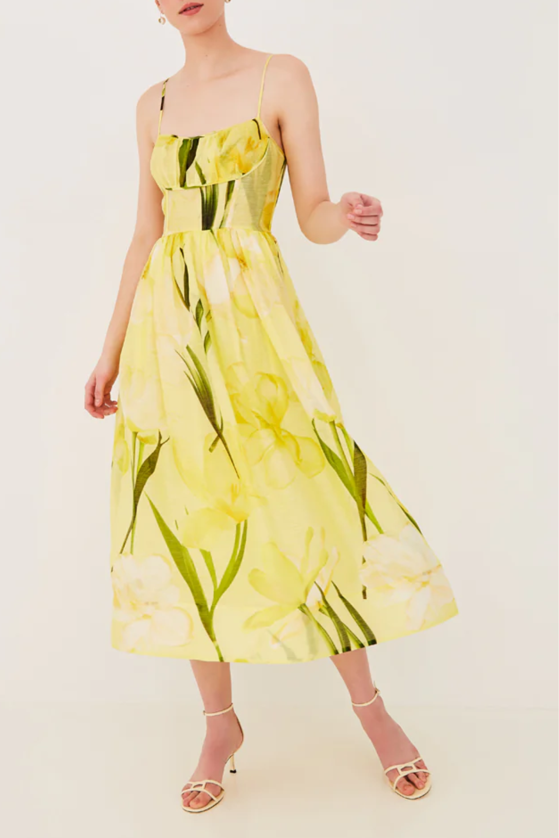 Midi length fit-and-flare with adjustable spaghetti straps and ruched bodice.