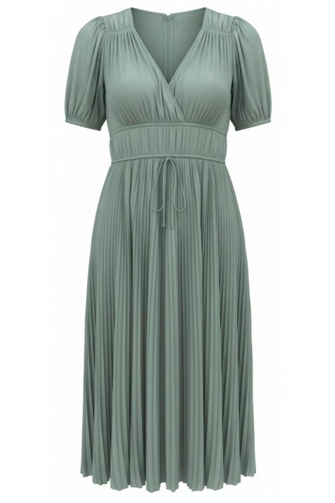 The Audra Dress is made from light green plissé satin with a silken texture and subtle sheen. A signature Ulla Johnson silhouette, it is pleated throughout with gently puffed sleeves and a billowing, fluid hemline.