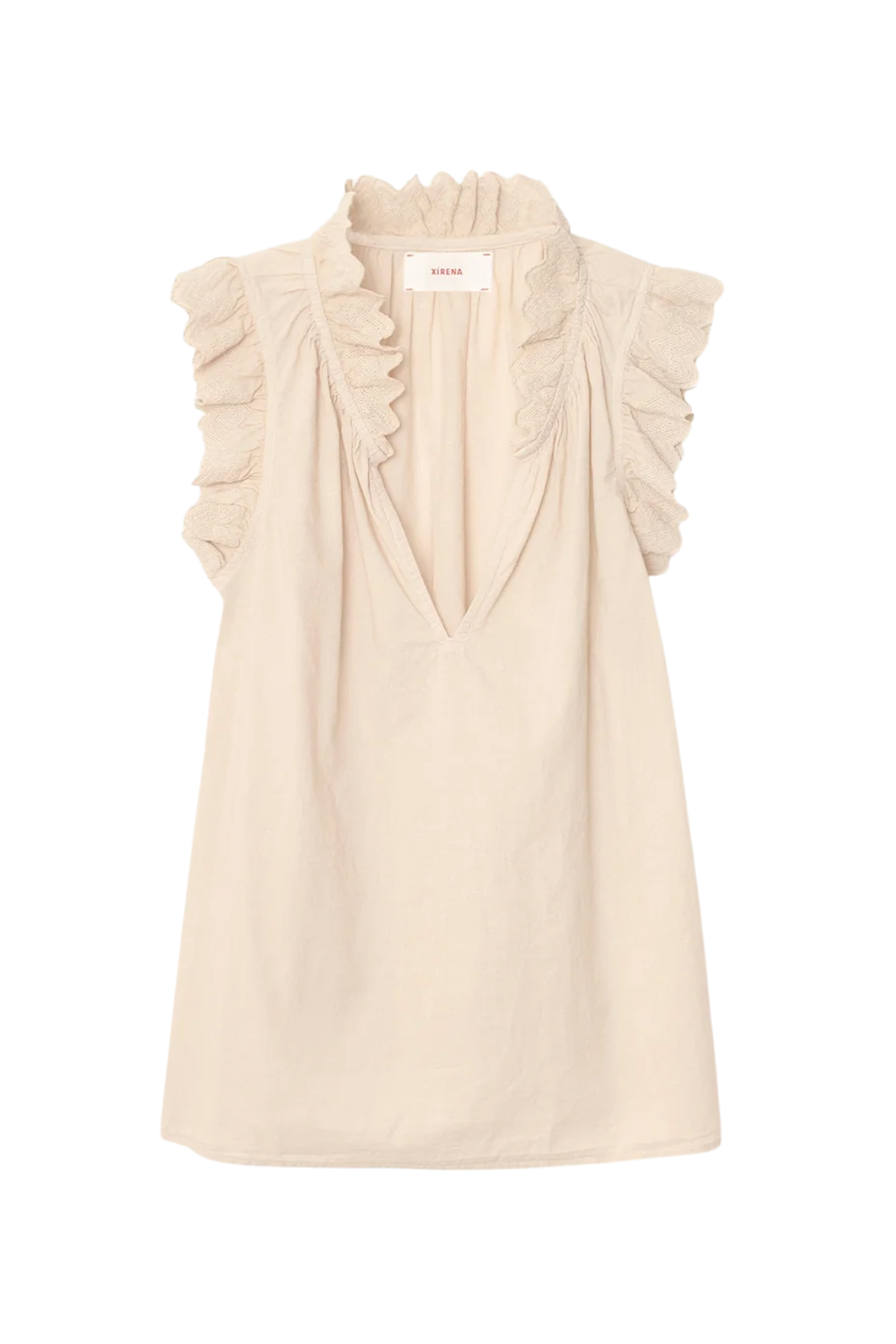 Ruffle Up. Bexie is new this season in XIRENA's washed double faced cotton gauze for a soft, gently crinkled feel. An update to their best-selling Bex Top, the Bexie features a deep V-neck, ruffle detailing with embroidered lace trim, and soft shirring throughout.