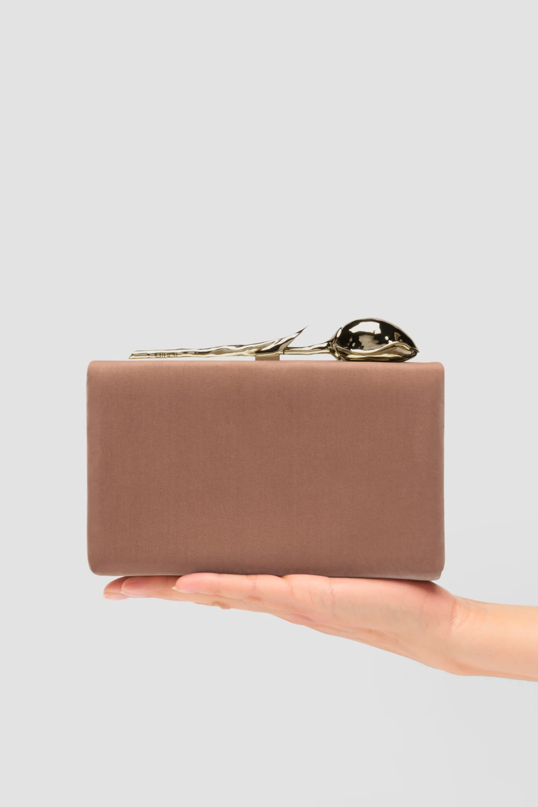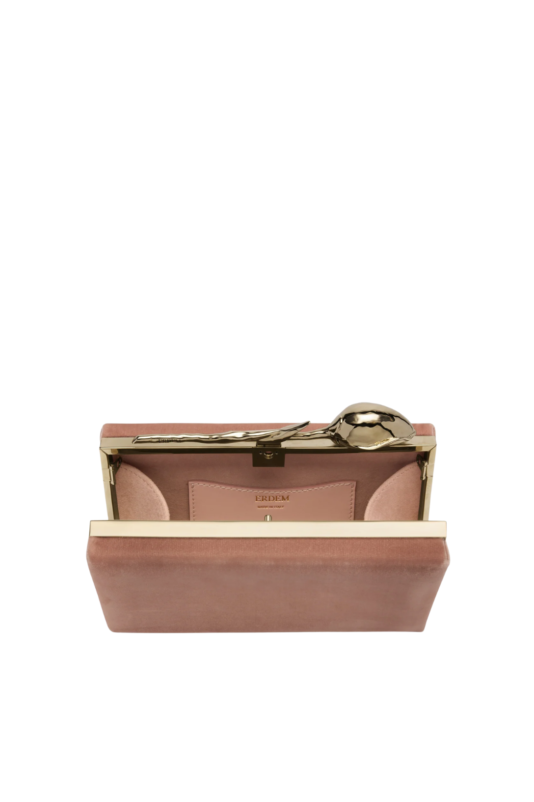 The Bloom Minaudière gold-toned flower bud floats elegantly along the top of the bespoke brass frame. It takes seven hours to produce using the lost wax casting method.