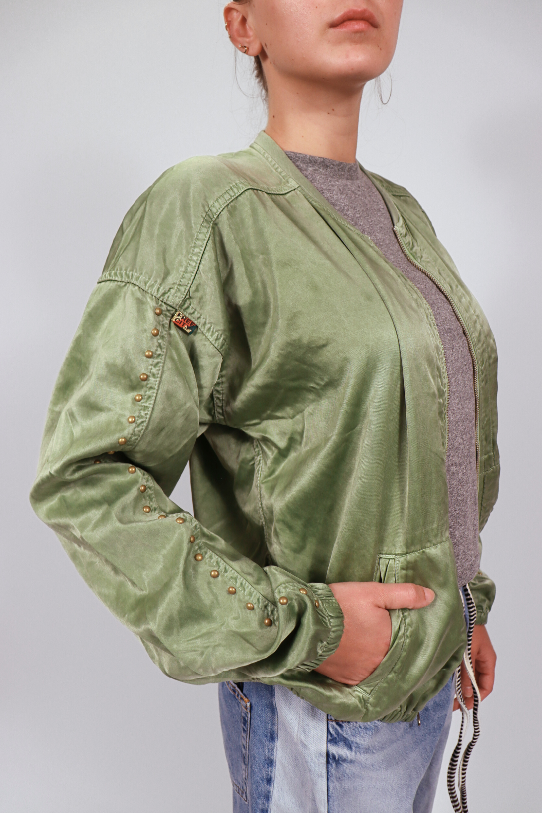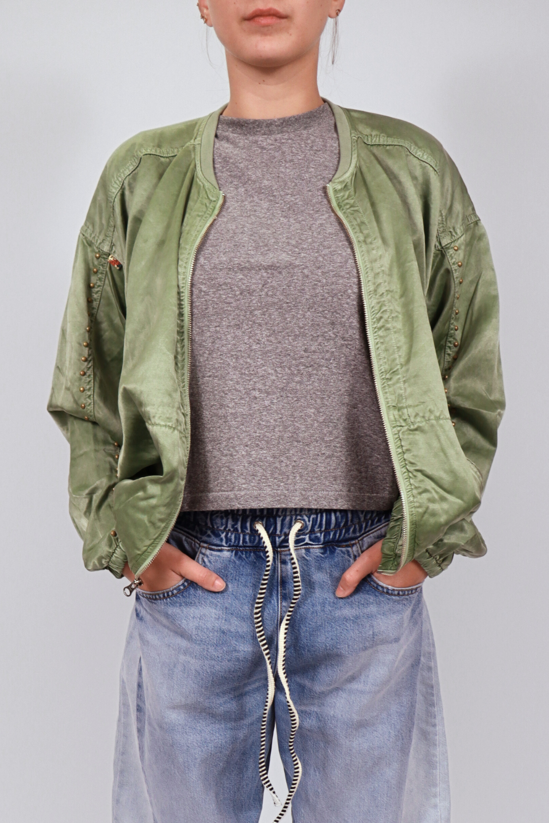 Unisex satin bomber/shell jacket in joshuas glass with custom sunfade dye (highs and lows). Home/stud with vintage brass studs down the sleeves. Relaxed fit with dropped shoulder and tapped seams.
