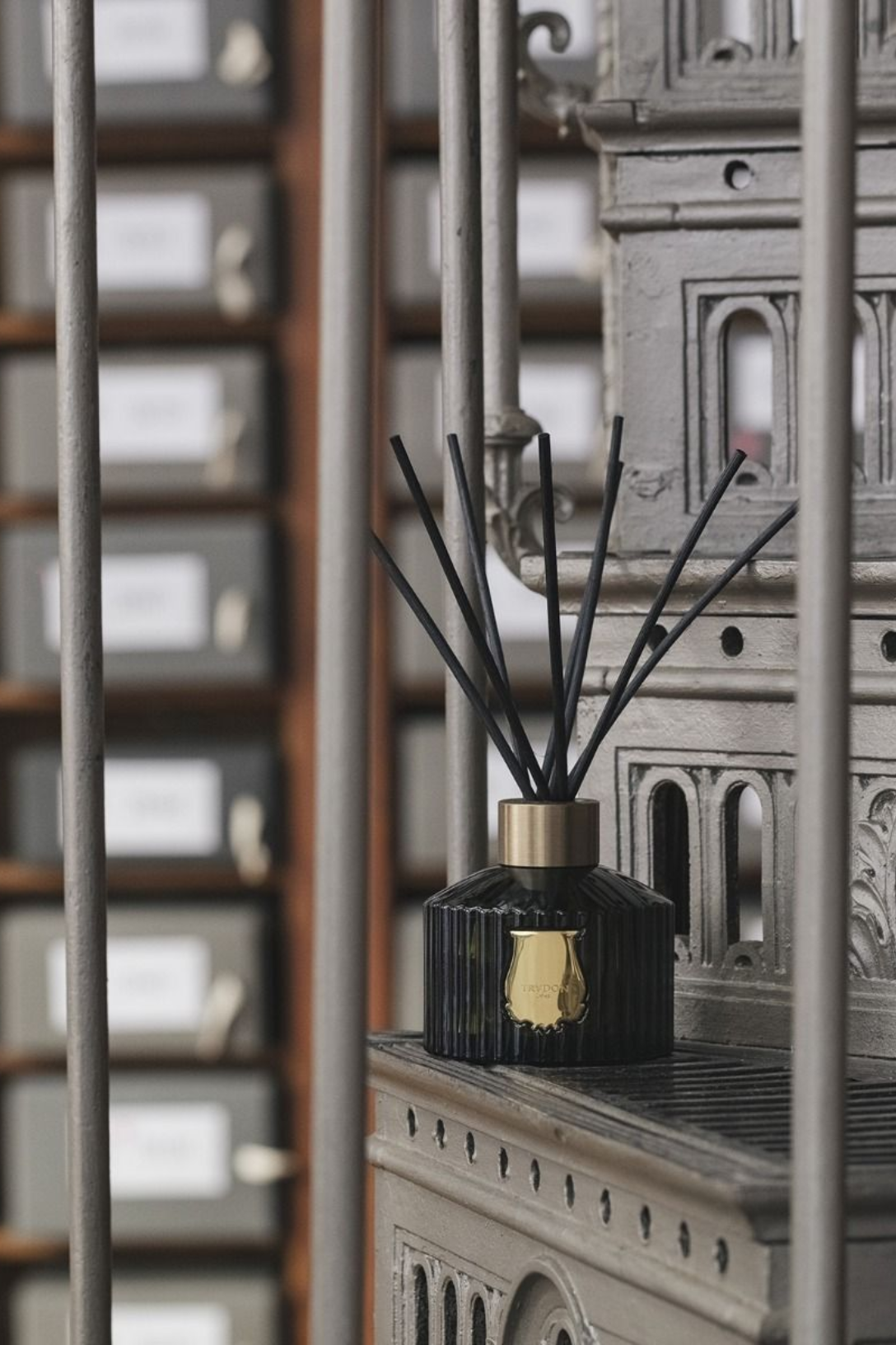 The collection of Home Objects welcomes a new icon: the Trudon Diffuser. Shaped out of the same emblematic Trudon-green glass, the 350ml fluted container is adorned with a gold emblem.