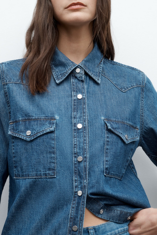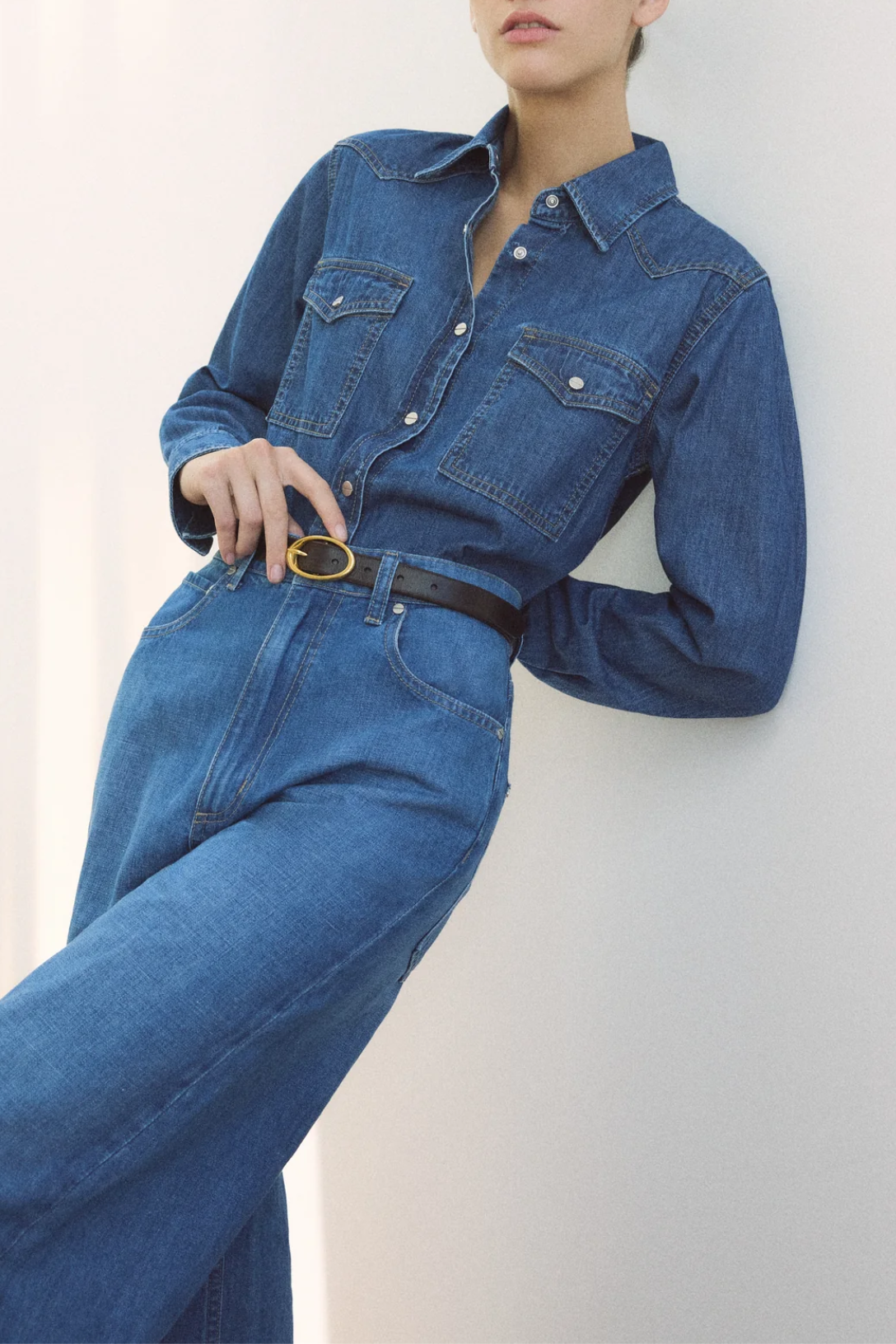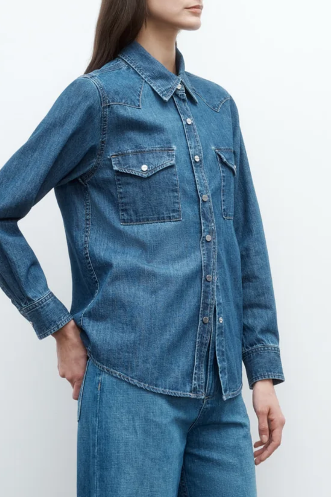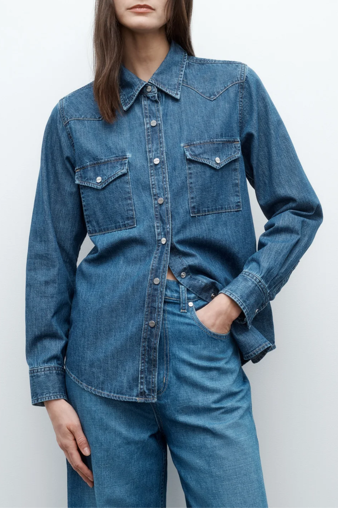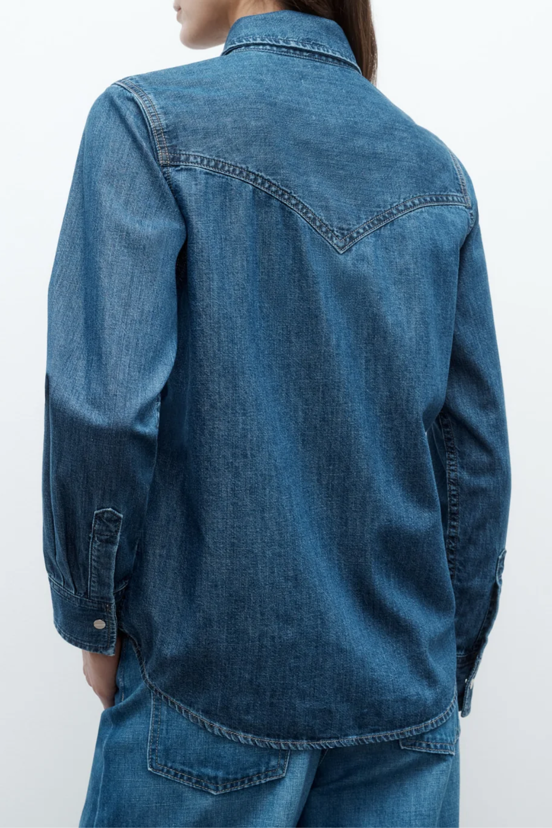 Western Shirt in authentic cotton denim, manufactured in LA. The Cowboy Take Me Away is a relaxed fit. Complete with utility details: a snap button placket, chest flap pockets, exposed yoke and custom applied rivet hardware.