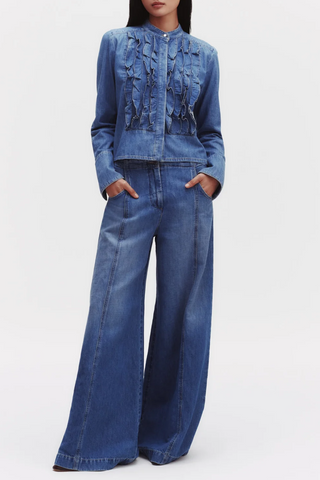 Mid-rise, ultra wide leg jeans in lightweight, washed cotton linen denim. Dancing in The Dark are relaxed, loose fitting paneled pants with exposed seams down the front. Complete with deep side pockets, a back pocket finish, concealed zip fly, and metal shank at the waistband.