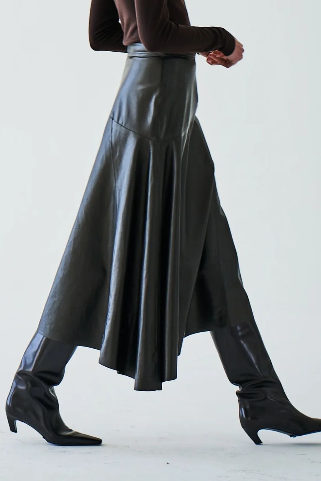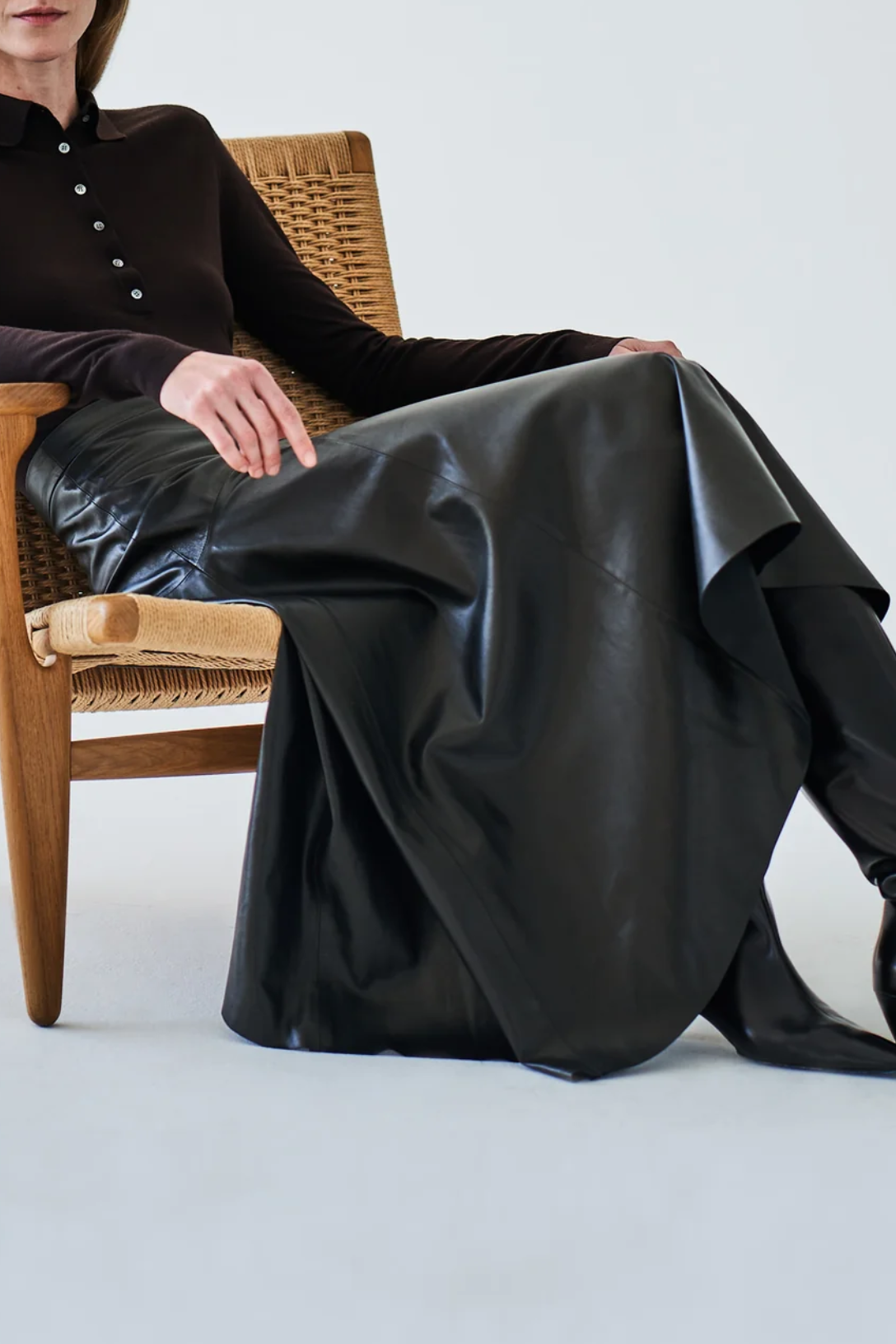 The Draped Skirt in Black offers a striking balance of edge and elegance. Crafted in Turkey from supple lambskin, this midi-length silhouette features an asymmetric hemline that falls longer on one side, creating fluid movement. Horizontal, off-kilter seams add subtle texture, while a discreet side zipper ensures a smooth, flattering fit. Styled together, the Draped Skirt and Jordan Polo create a look that’s equal parts polished and effortless.