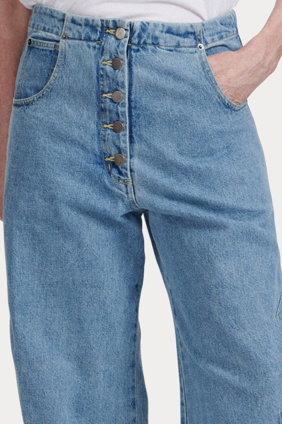 - Exposed button fly closure