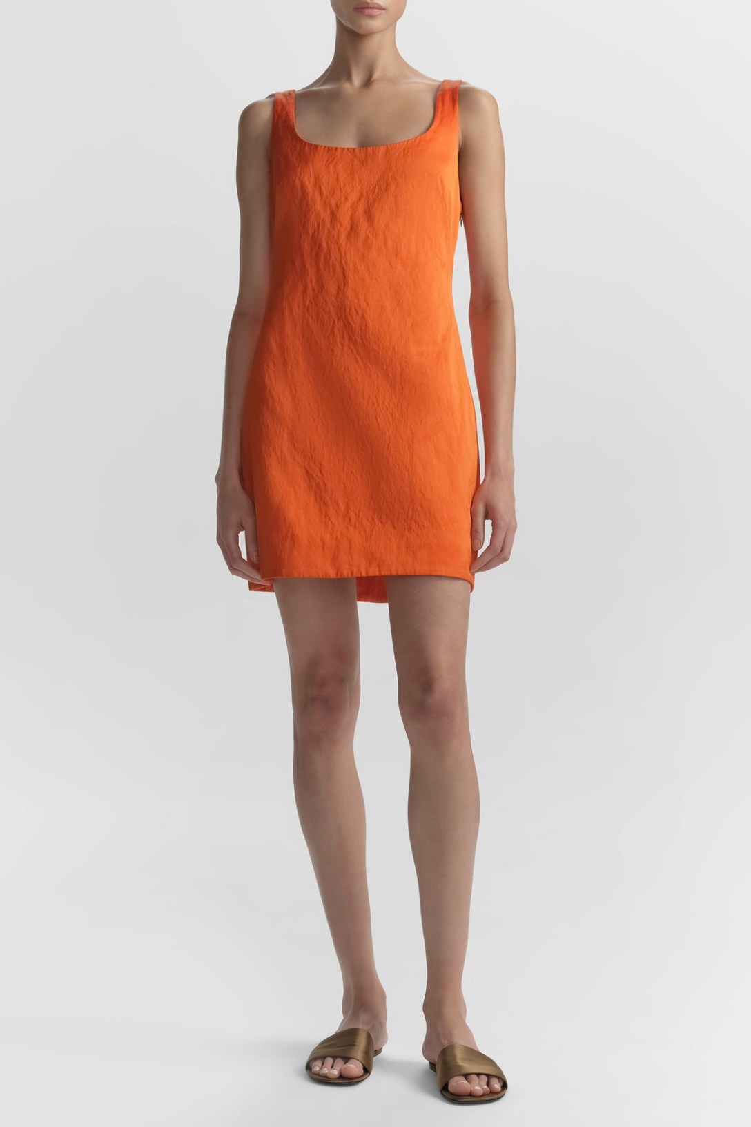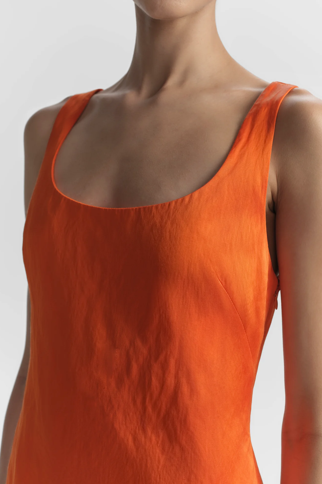 The Faye Dress is crafted from cotton metal satin with a dimensional, crinkled texture and subtle pearlescent sheen. This sleeveless mini features a square neckline and tailored fit. Due to the non-stretch nature of this fabric, you may consider taking one size up depending on your desired fit.