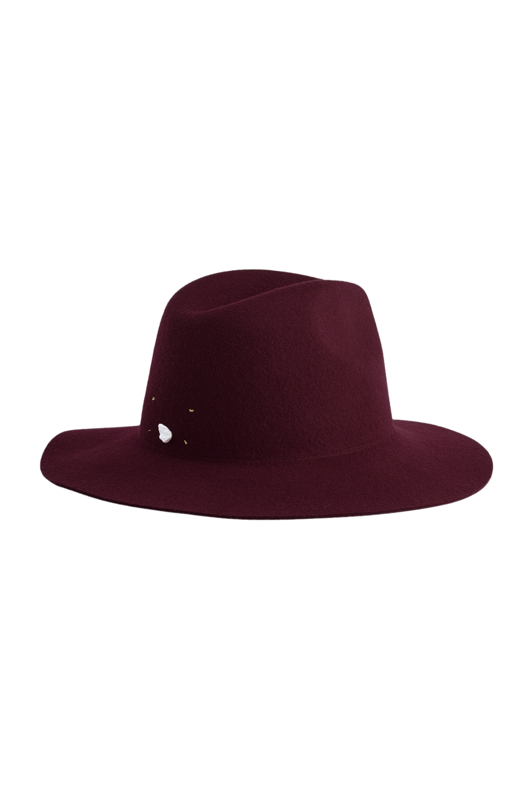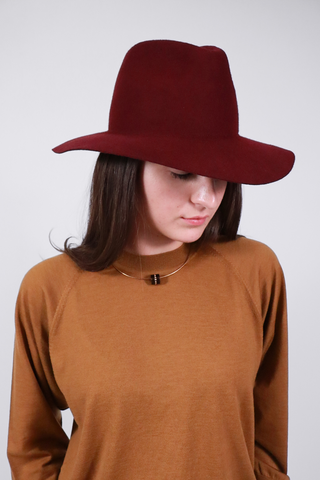 A classic design energized with up–to–date proportions defines this new felt hat with a straight brim and contoured shape. It has been doused in the warm hues of the season and will perfectly complement the dresses and coats in the collection.