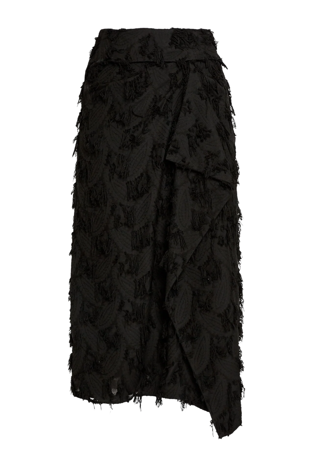 This black skirt is draped from fringed paisley jacquard and has an asymmetric hem.