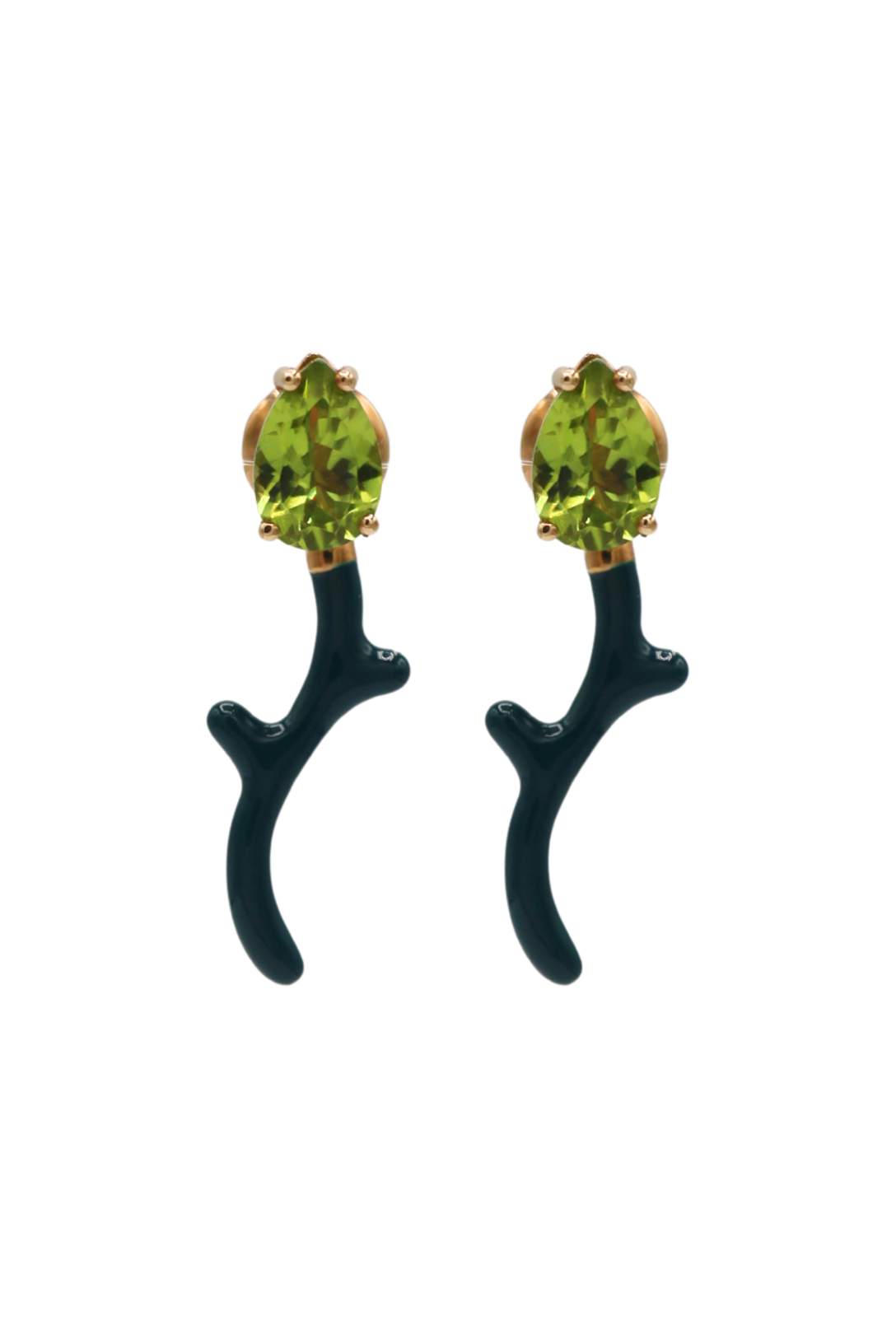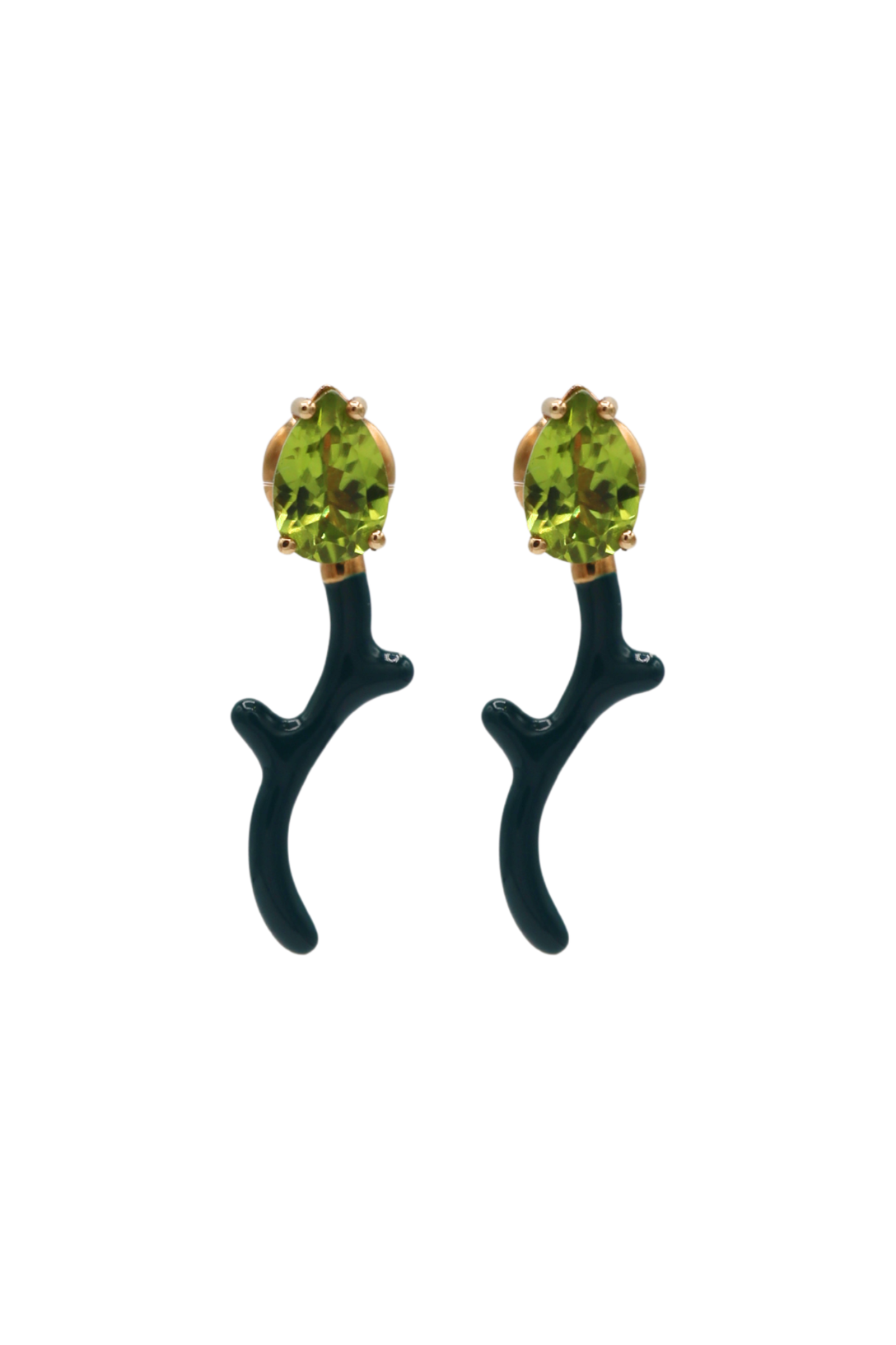 Foxy Earring with Teal Enameling and Drop Cut Peridot by Bea Bongiasca.