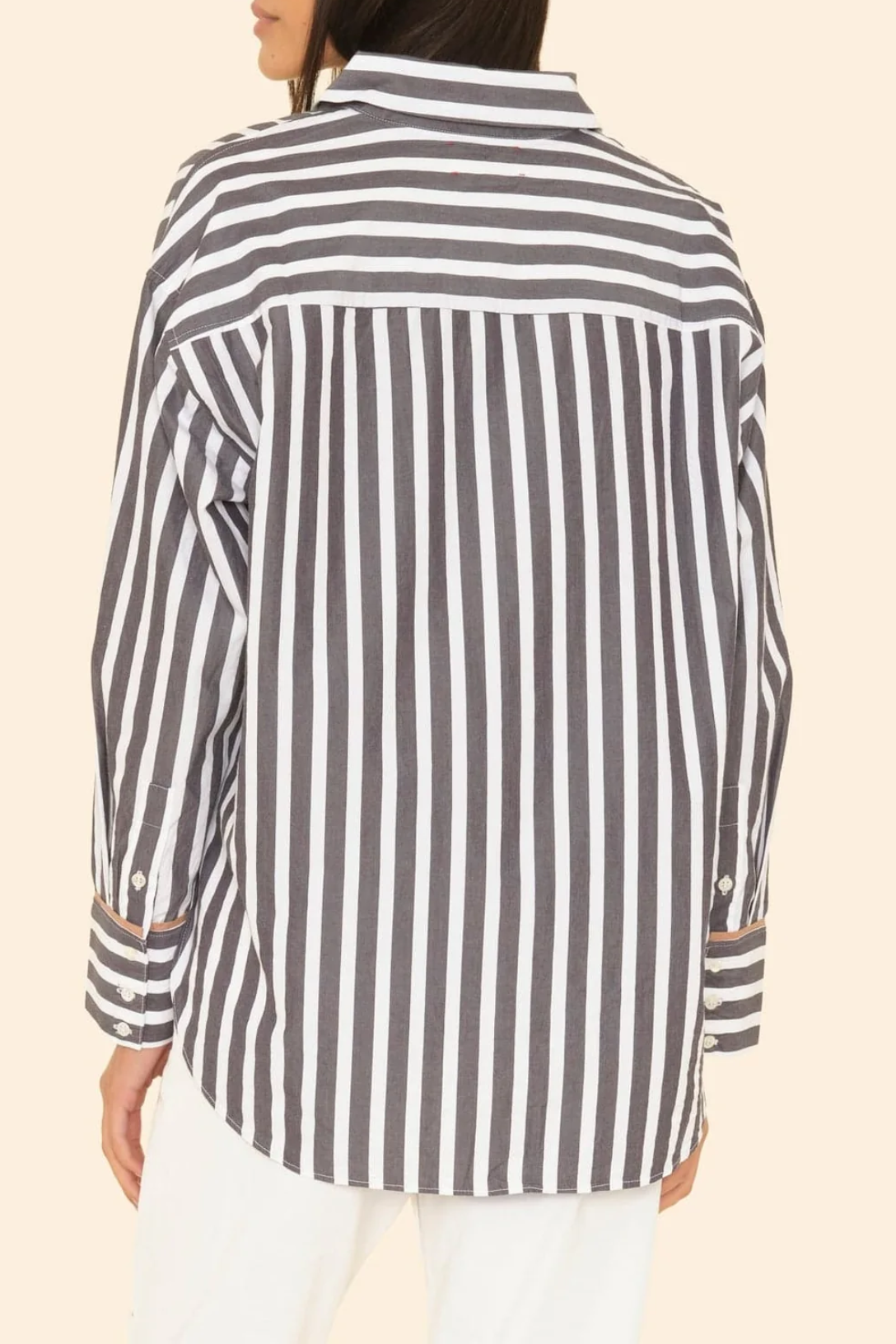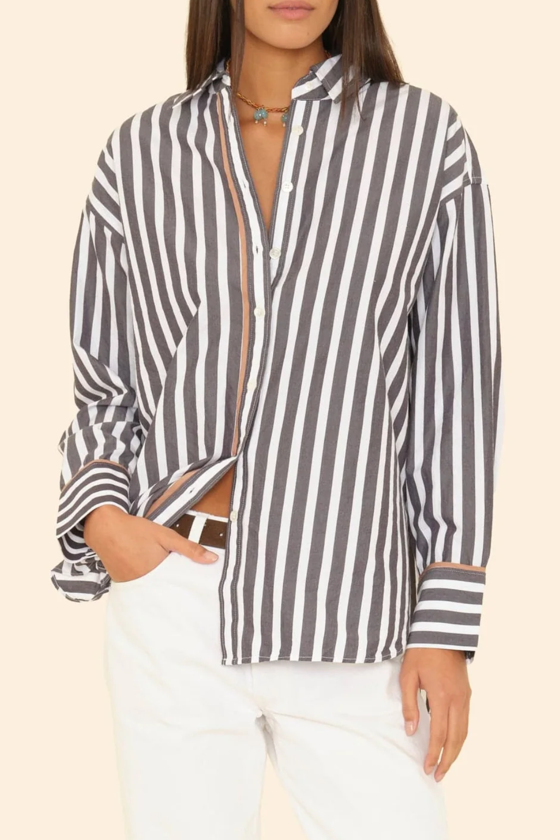 Striped Delight. Gillan is new this season in XIRENA's crisp multicolor stripe cotton. Gillan is a relaxed button-front shirt with contrast color piping along the placket and sleeves cuffs.
