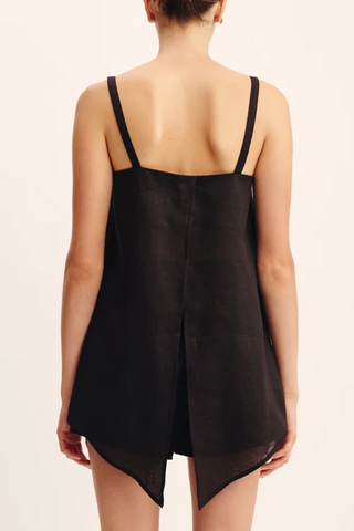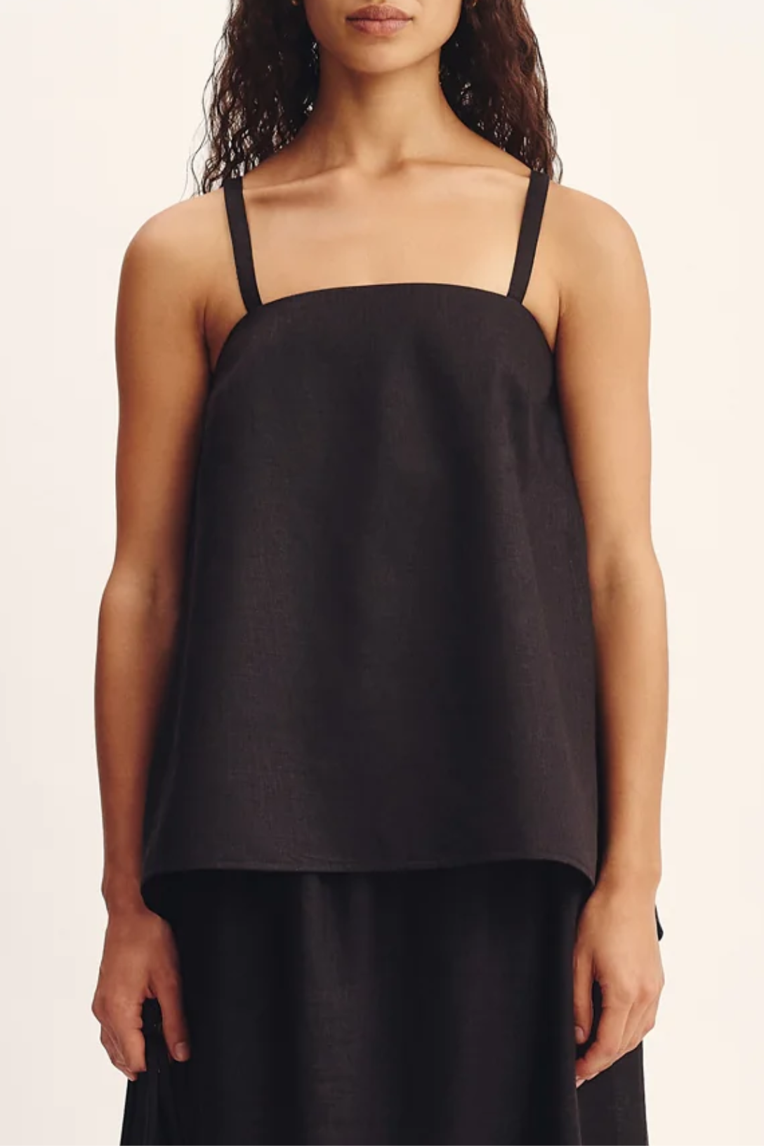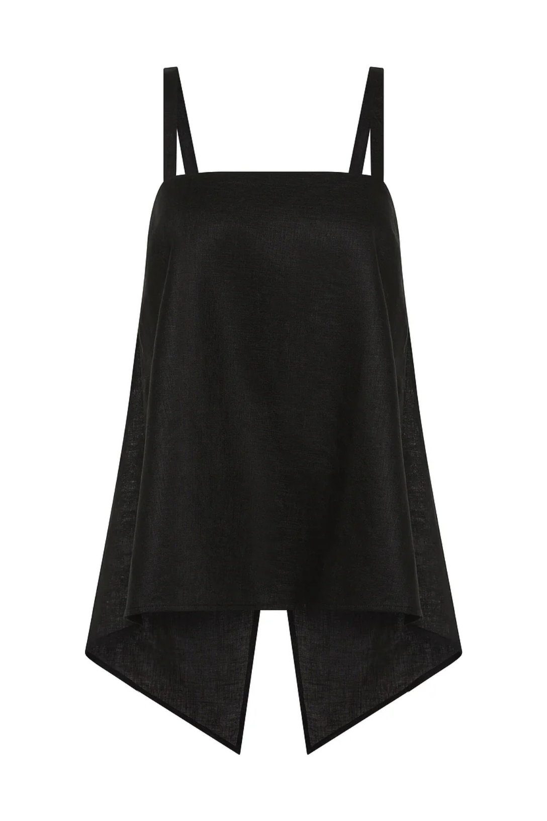 The Ginny Top is cut from airy linen in a relaxed silhouette. It features a square neckline, thin straps and a statement split at the back.