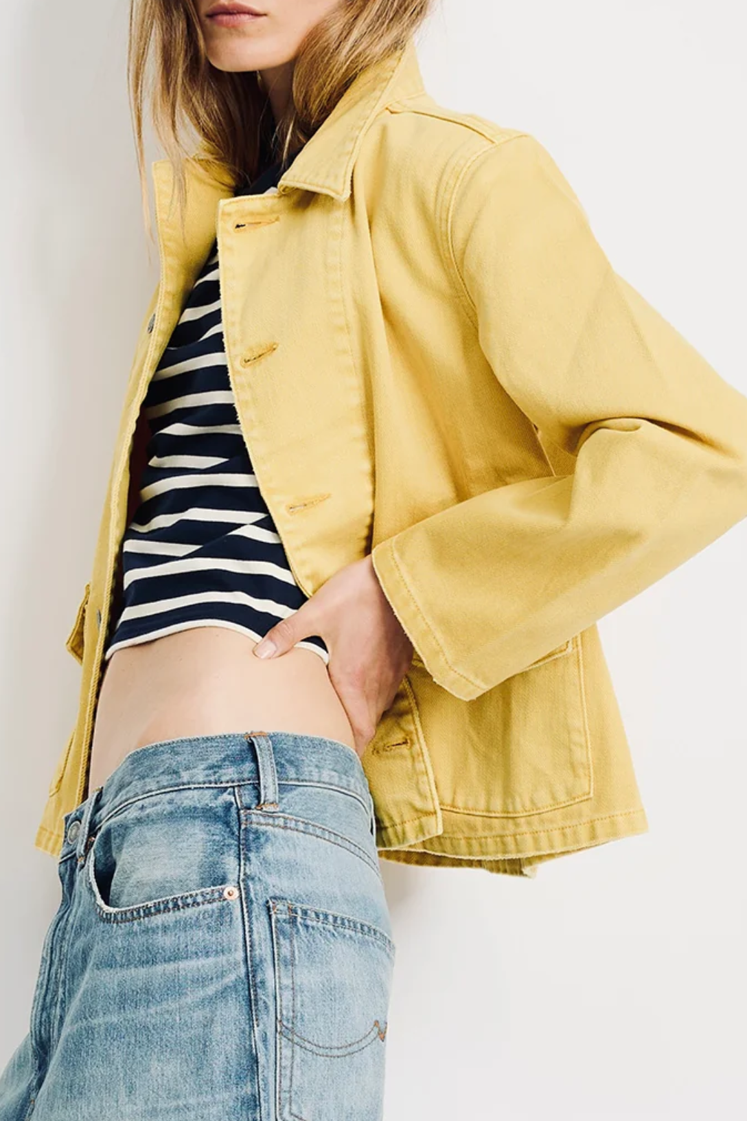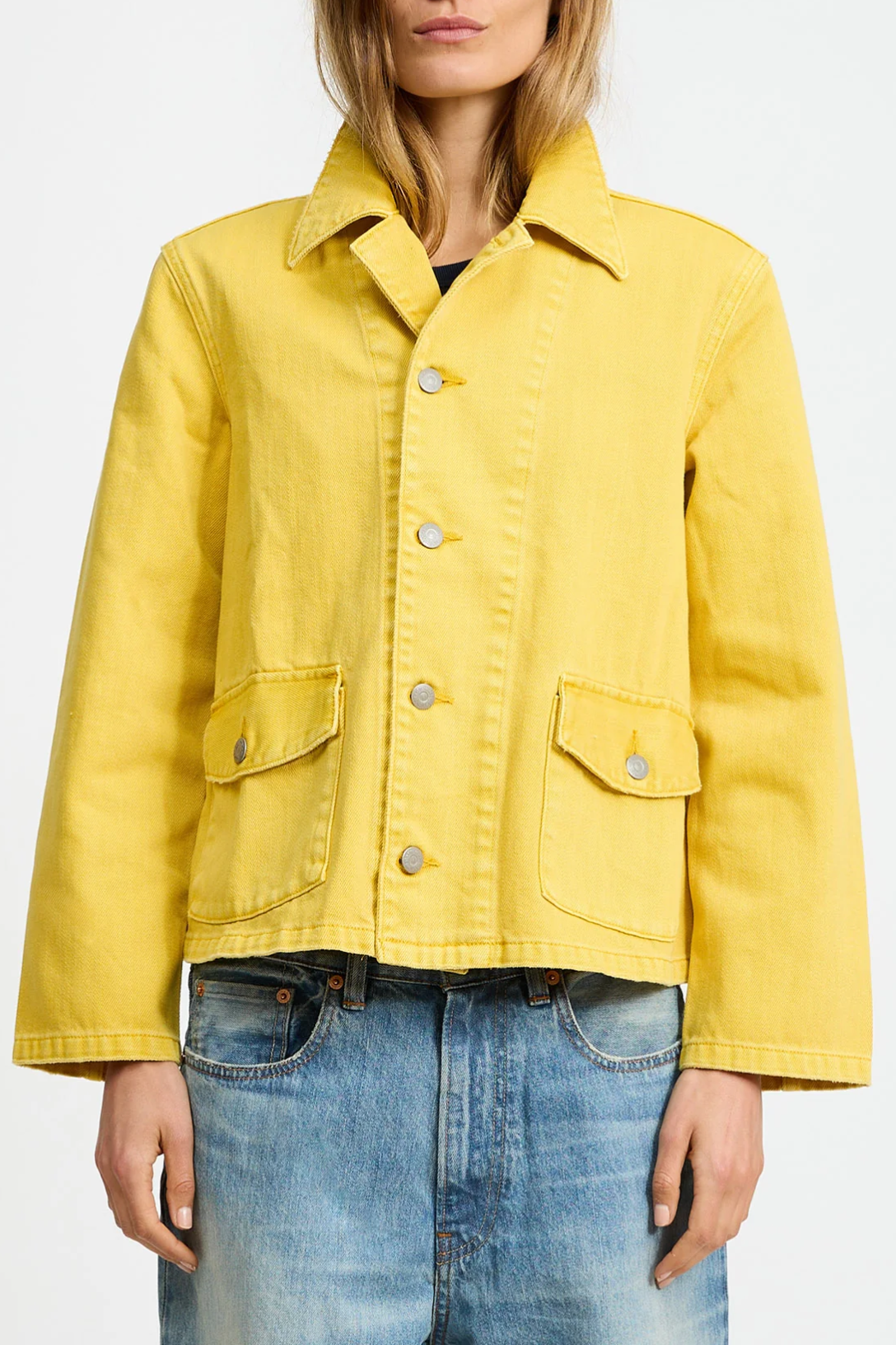 Cropped utility jacket with a boxy silhouette. Cut from rigid denim and garment dyed for depth of color. Features a spread collar, button front, and two flap pockets with snap closures. Finished with tonal stitching and a raw hem.