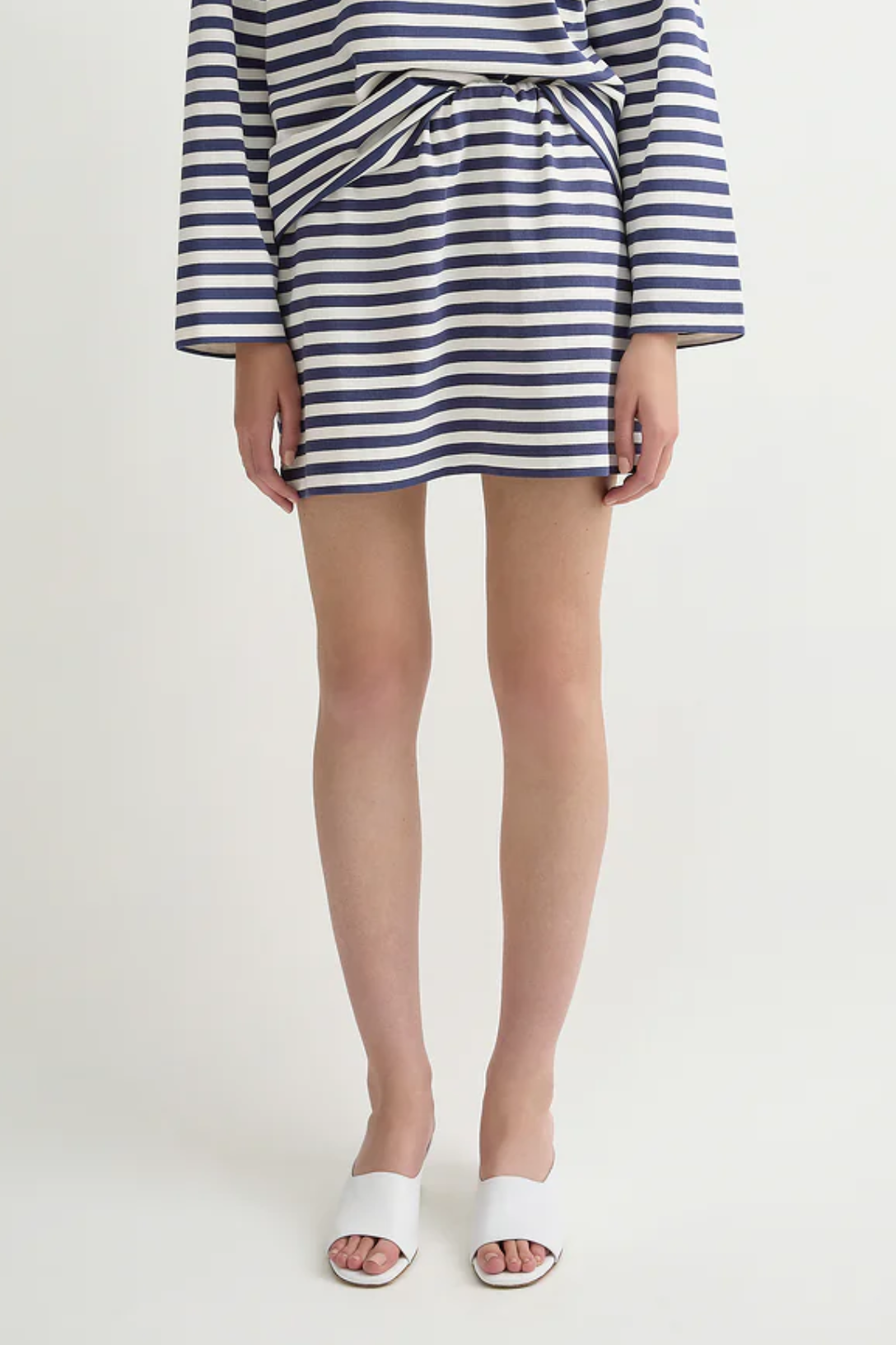 Crafted from 100% cotton, the Haisley Skirt is patterned in a timeless navy and ivory stripe. Designed to sit high on the waist, it features a comfortable elastic waistband and A-line silhouette. Style yours as a set with the Haisley Jumper.