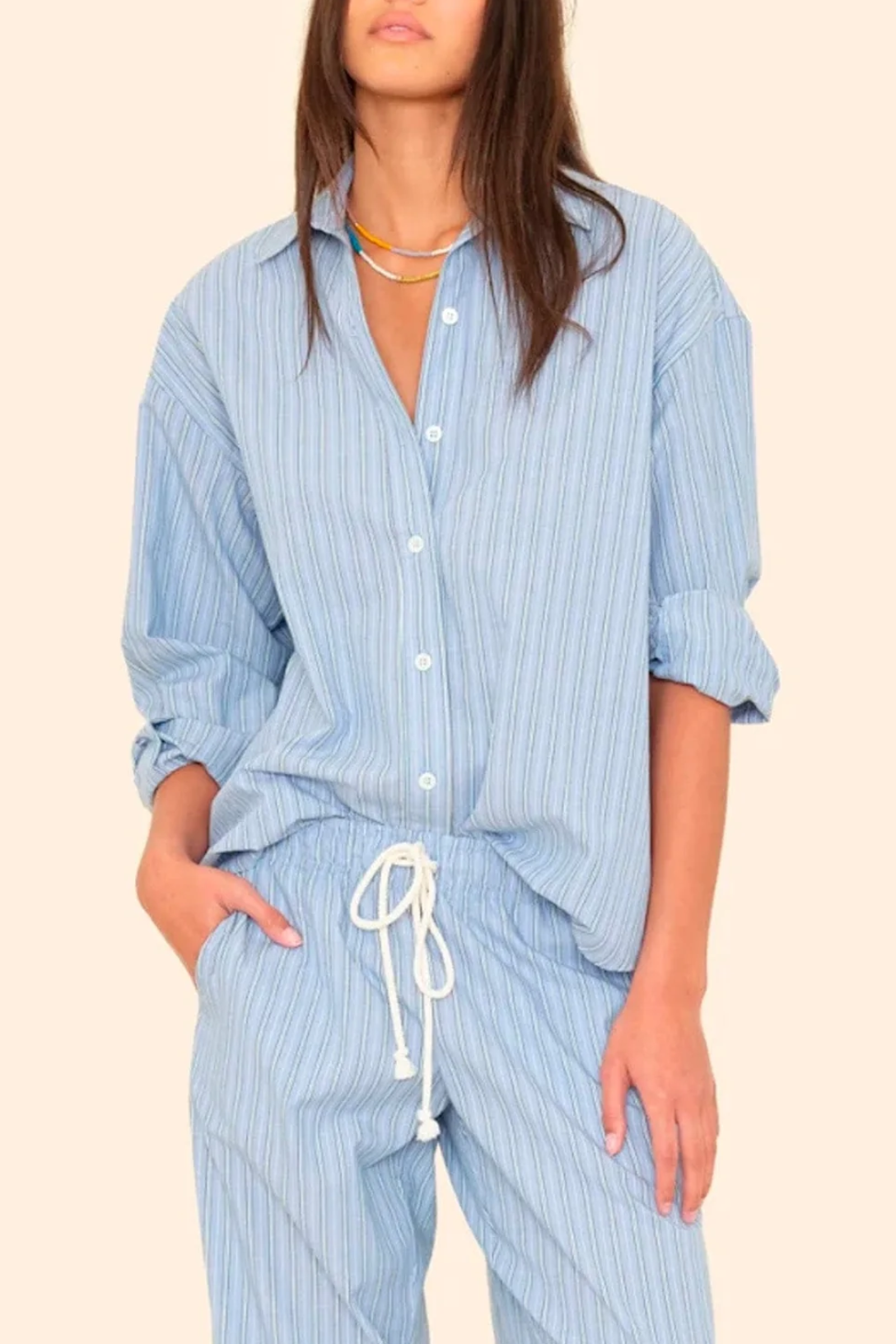 Earn your stripes. Hayven is an oversized, menswear-inspired button-down shirt made in XIRENA's lightweight cotton stripe.