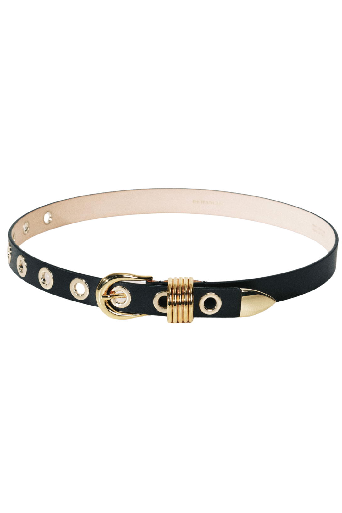 The Rivet belt carries an elevated edge. Inspired by Déhanche’s signature Revenge belt, its design reimagines grunge with elegance: each grommet set in polished 24K gold.