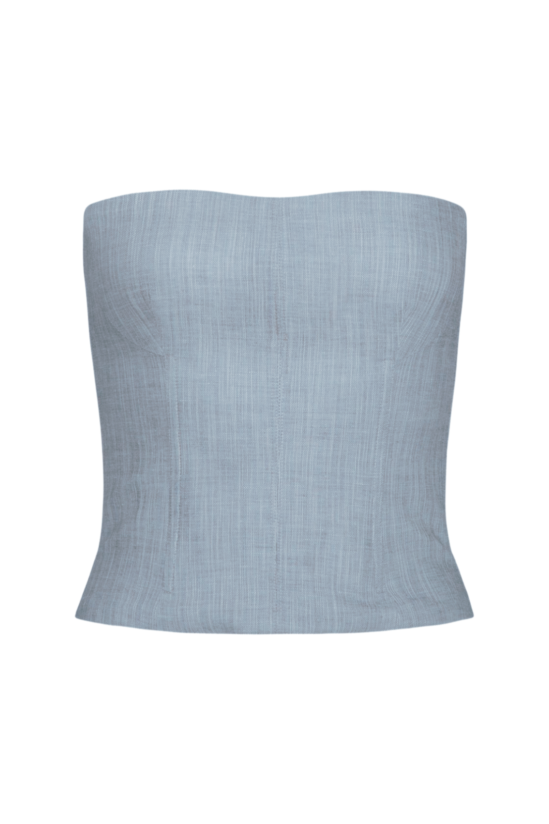 Strapless bustier in light indigo hemp. The Jillian Bustier is a form fitting top to compliment the natural silhouette. Complete with bust darts and an exposed metal zipper at the back.