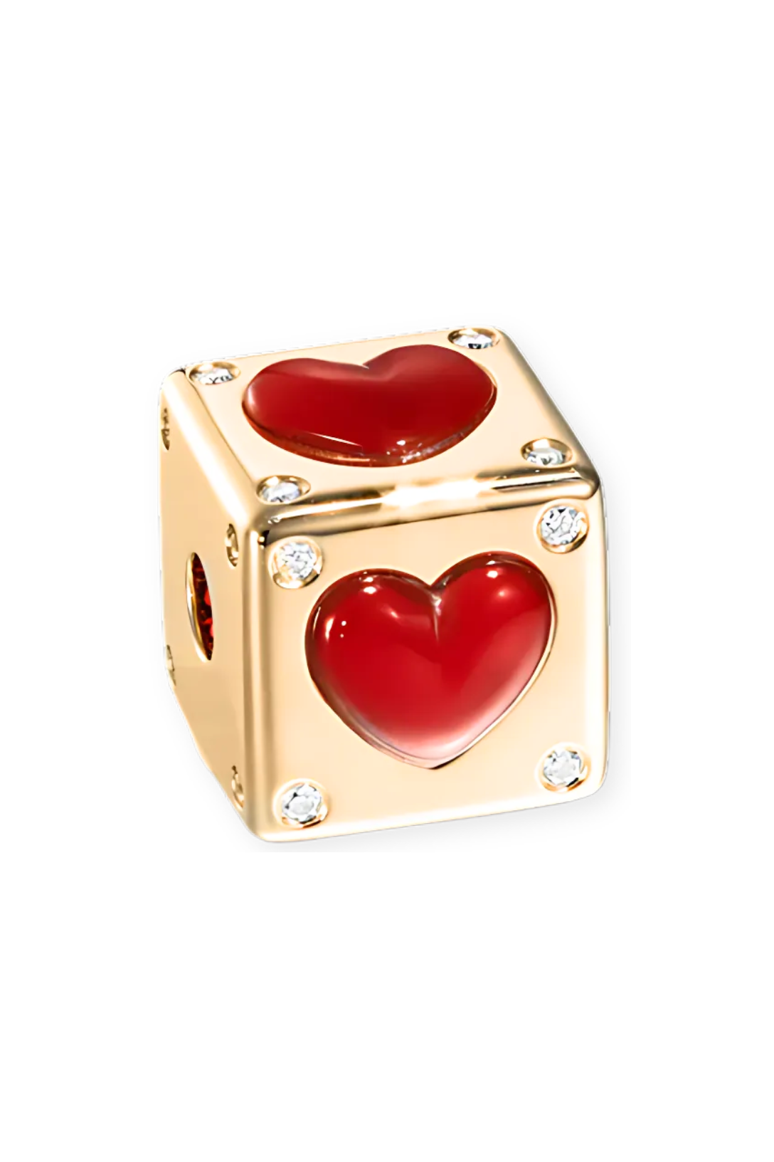 A playful nod to retro keepsakes, this Boochier charm reimagines the classic dice in solid 18K Yellow Gold, inlaid with vibrant carnelian hearts on each side. Measuring 15mm, it captures the brand’s signature blend of nostalgia and fine craftsmanship. Pair it with Boochier’s Nostalgia Chain for a whimsical yet elevated look.