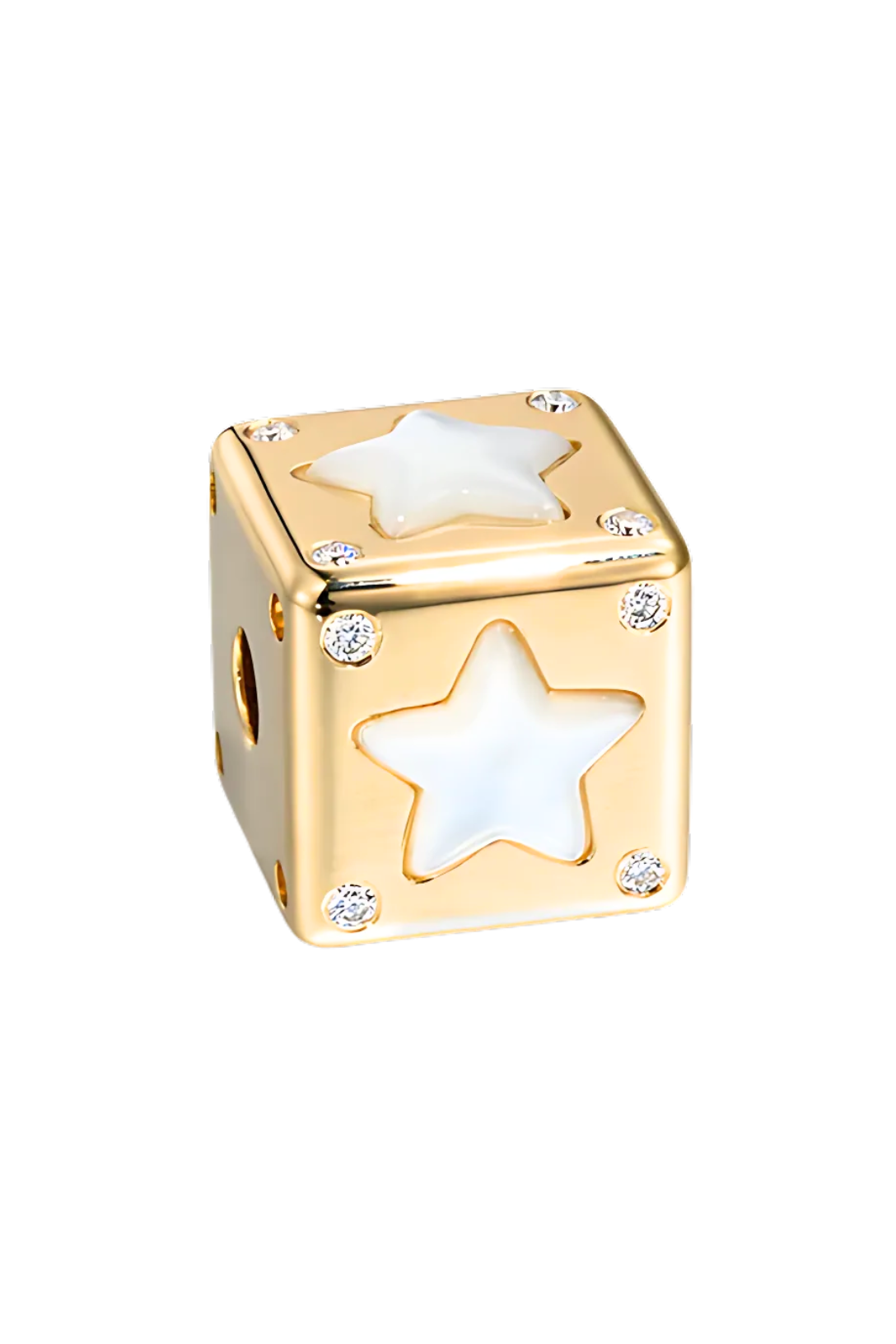 A playful nod to retro keepsakes, this Boochier charm reimagines the classic dice in solid 18K Yellow Gold and is finished with inlaid white mother-of-pearl stars. The softly luminous details give the dice a subtle, whimsical feel. Style it with Boochier’s Nostalgia Chain for a touch of charm with a twist.