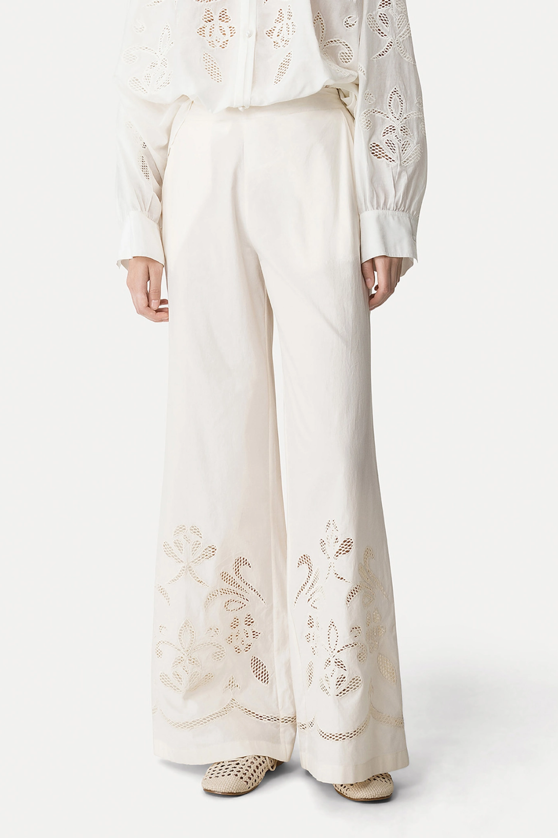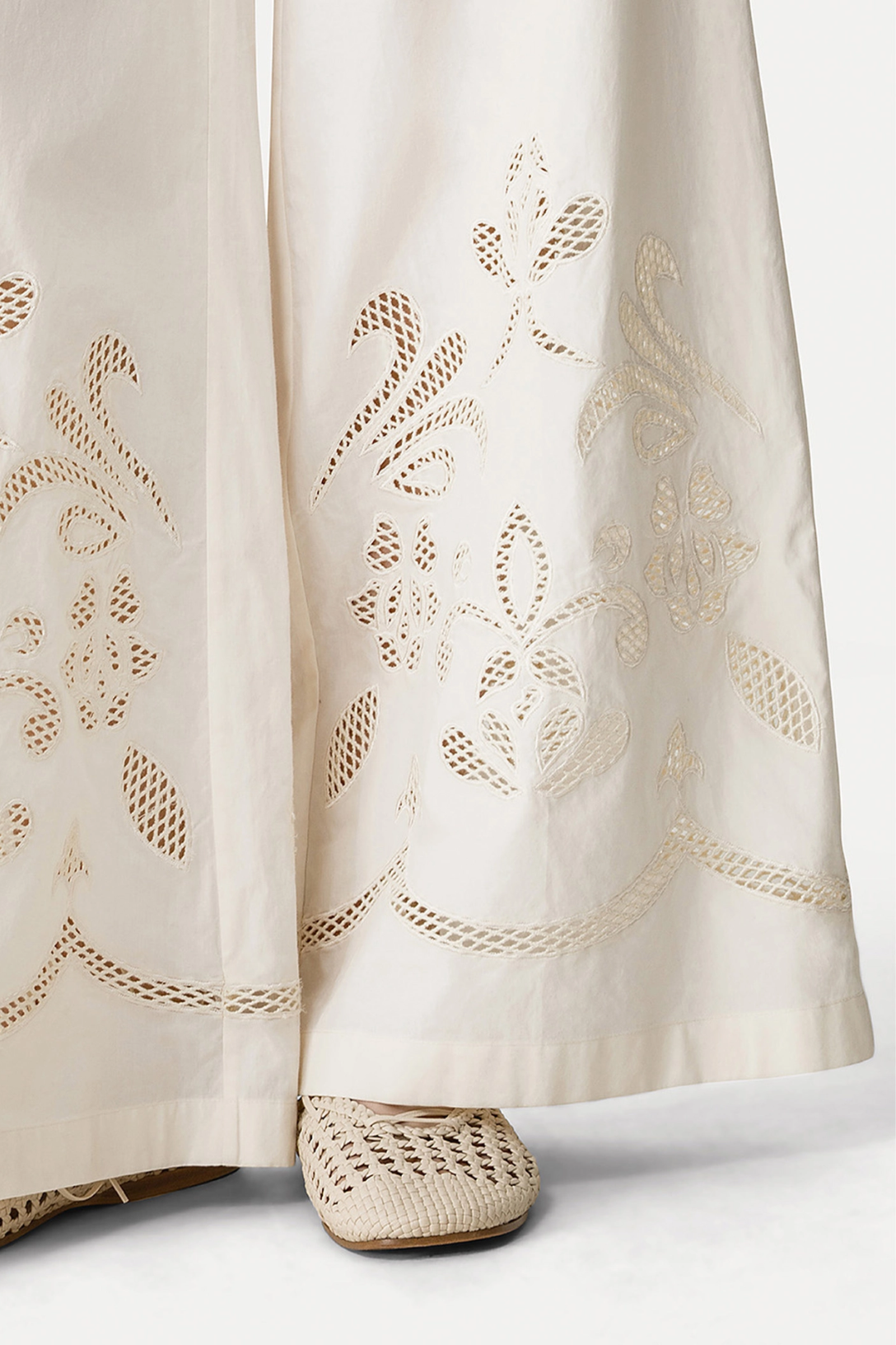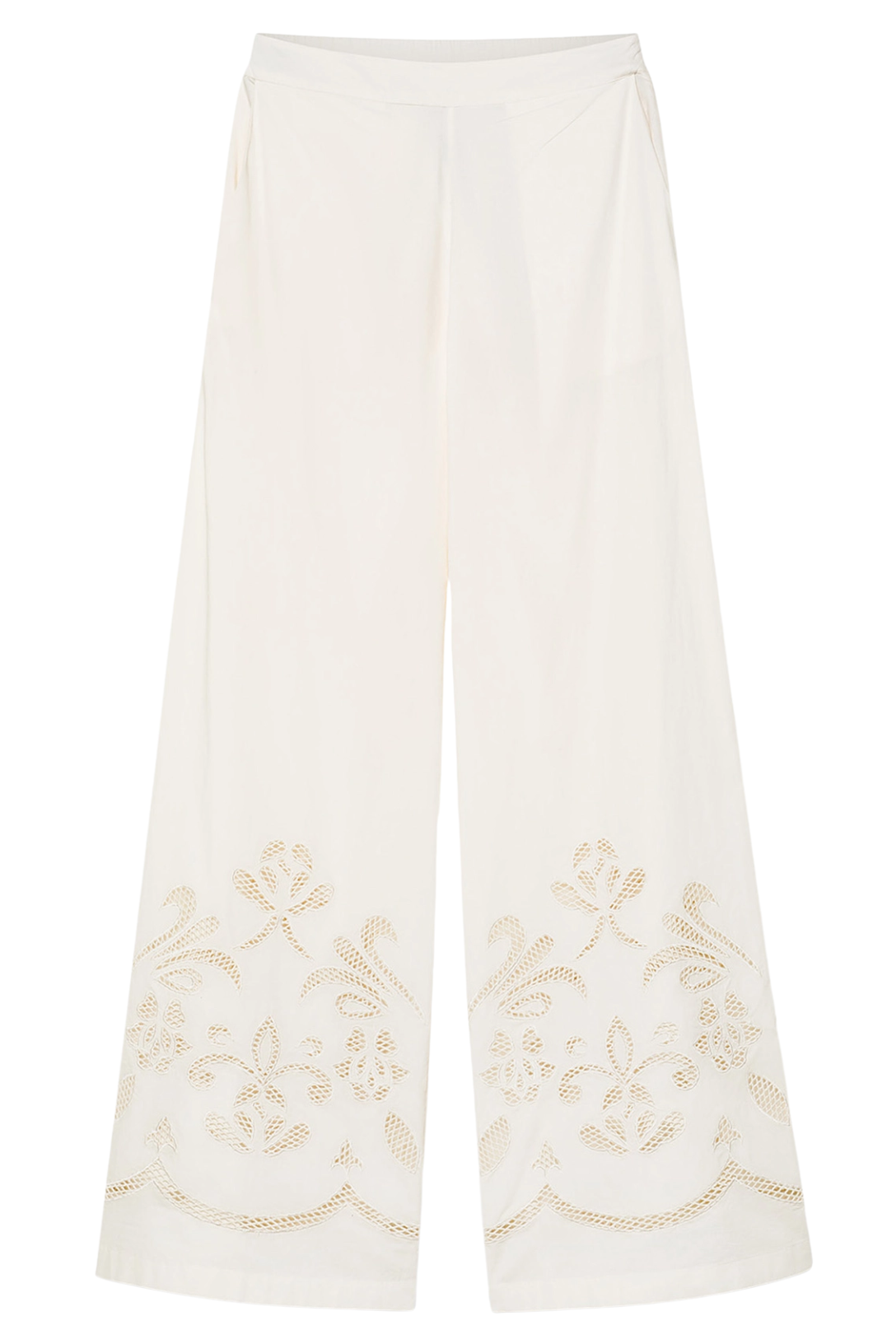 The golden shoreline reveals small, embroidered treasures, delicately placed on this cropped poplin trouser. Soft and slightly flared on the leg, with a clean front and elastic back, it features refined openwork embroidery along the hem.