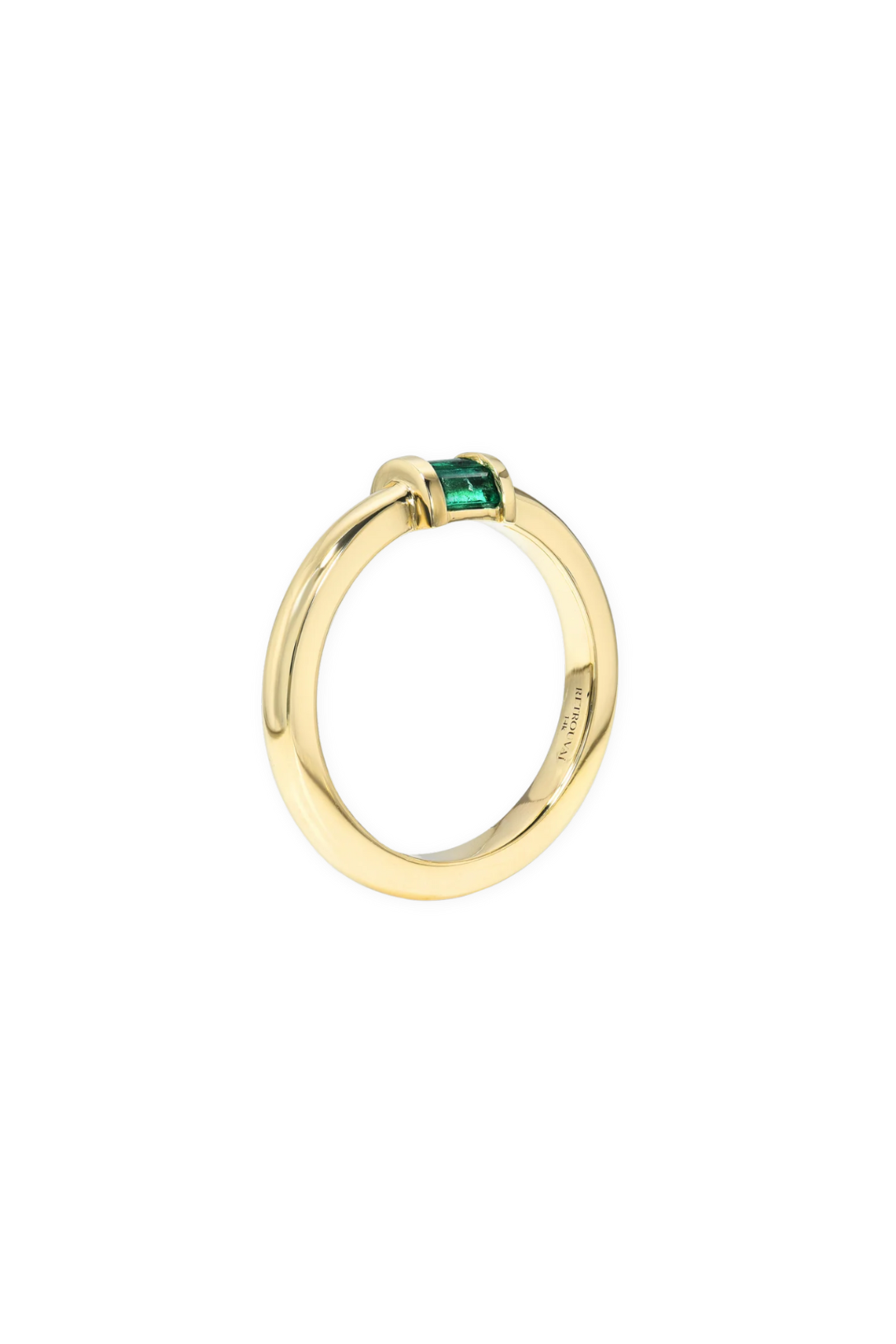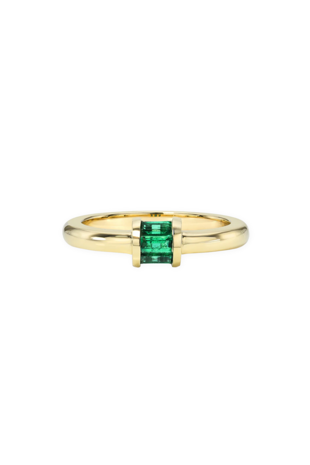 Polished 14K Yellow Gold ring with a 3 baguette barrel of Emeralds totaling .30cts.