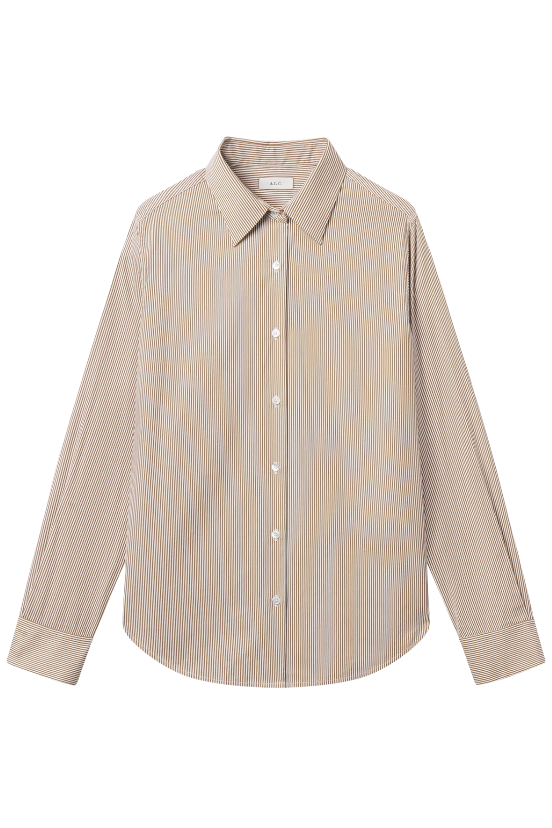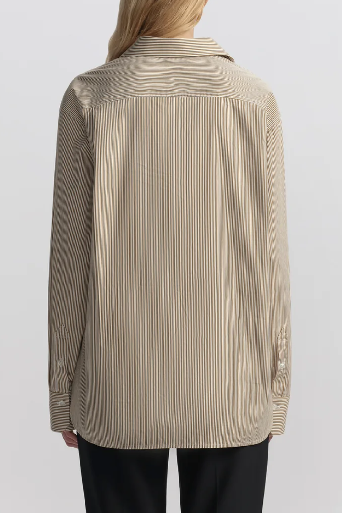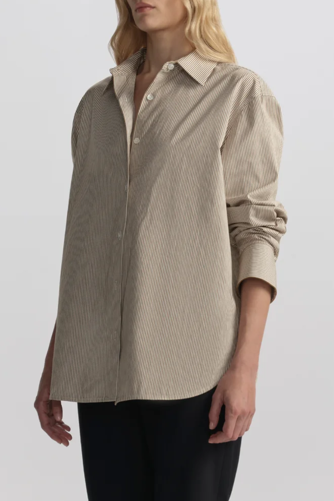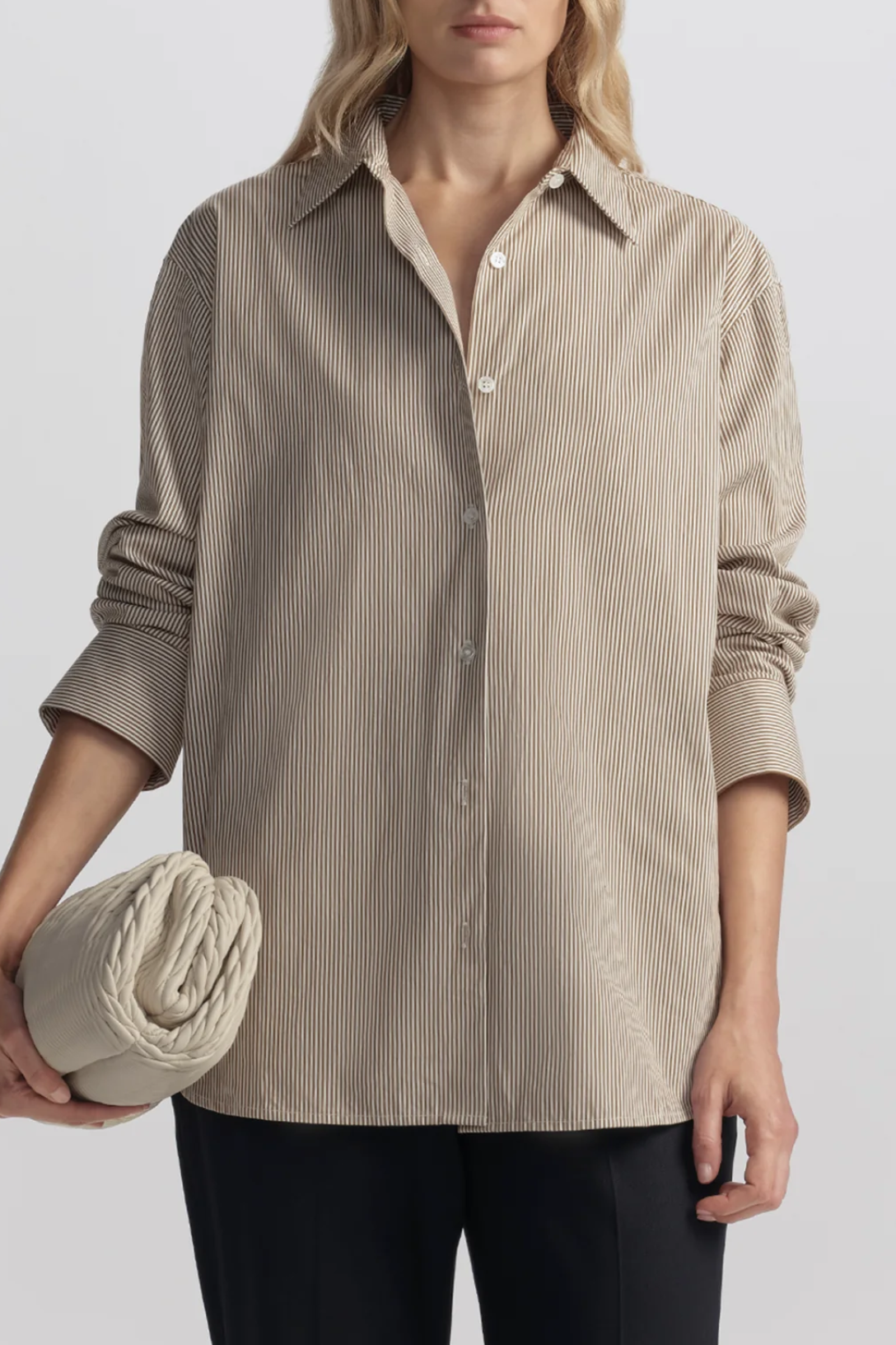 The Mason Shirt is crafted from 100% cotton in a pearl and aged bronze yarn-dyed stripe. This relaxed button-front silhouette features a pointed collar and softly pleated cuffs.