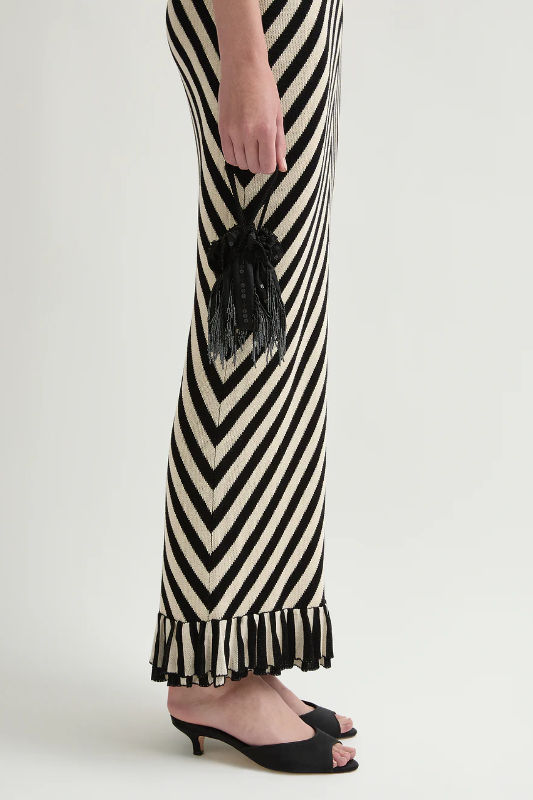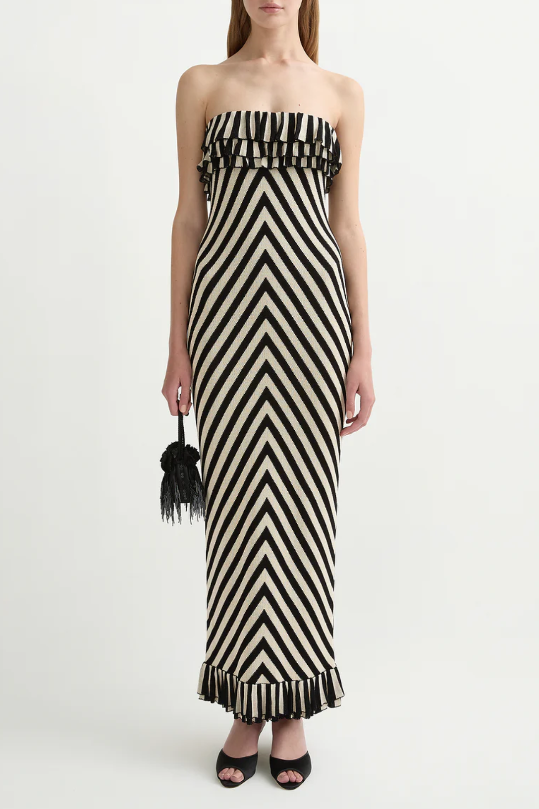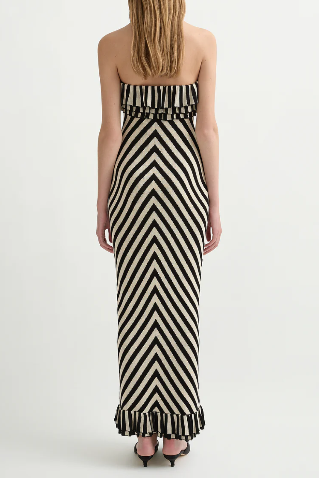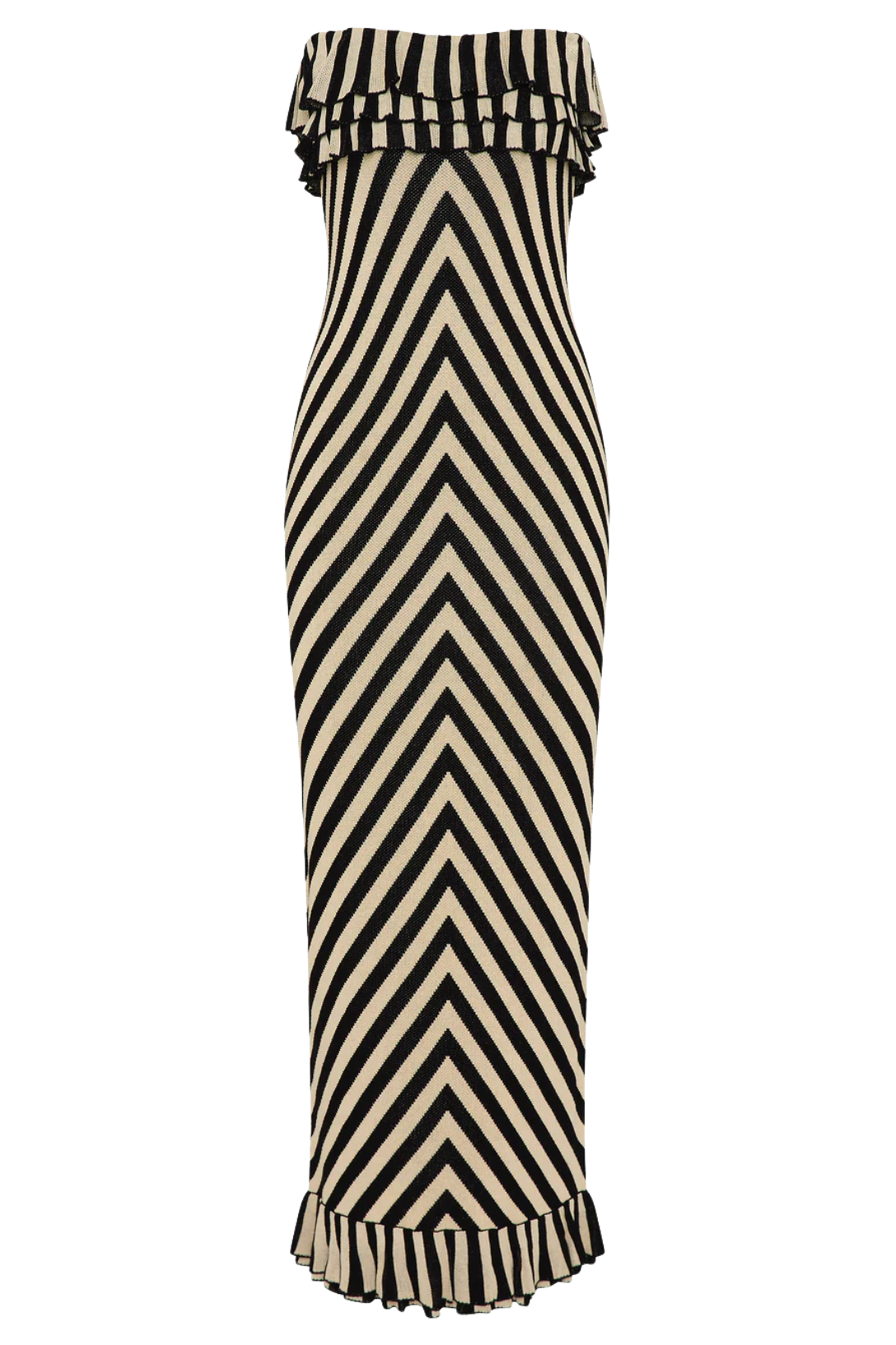 The Miles Dress is crafted from a soft knit, featuring directional cream and black stripes. Designed with bust and hem frill details, it has a close, figure-hugging silhouette.
