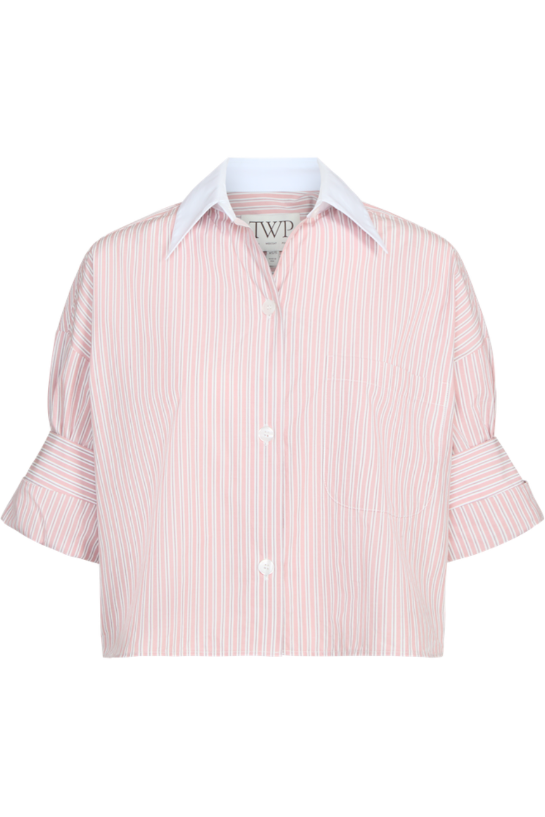 Cropped, short sleeved button down in striped superfine italian cotton shirting. The Next Ex is a boxy silhouette. Complete with a chest patch pocket, button up placket, spread collar, and signature double roll button cuffs.