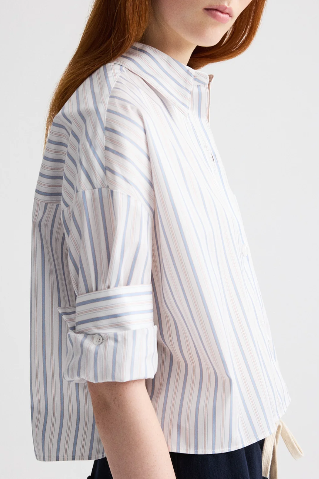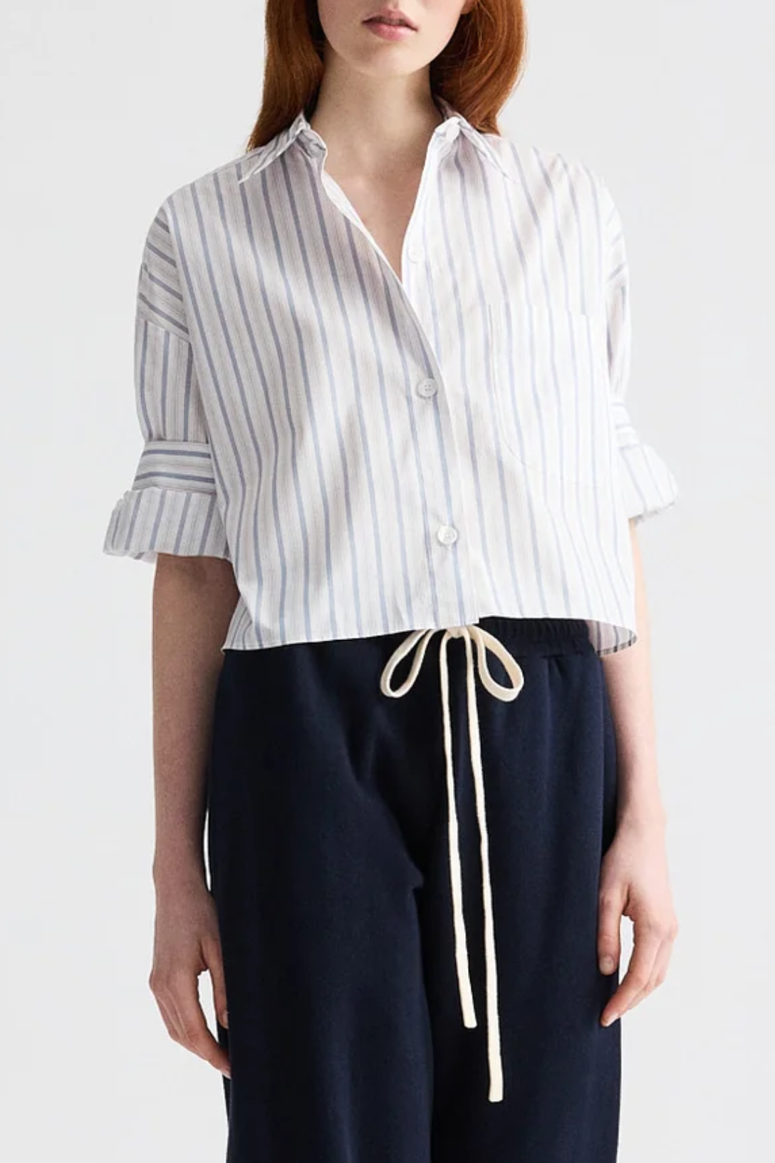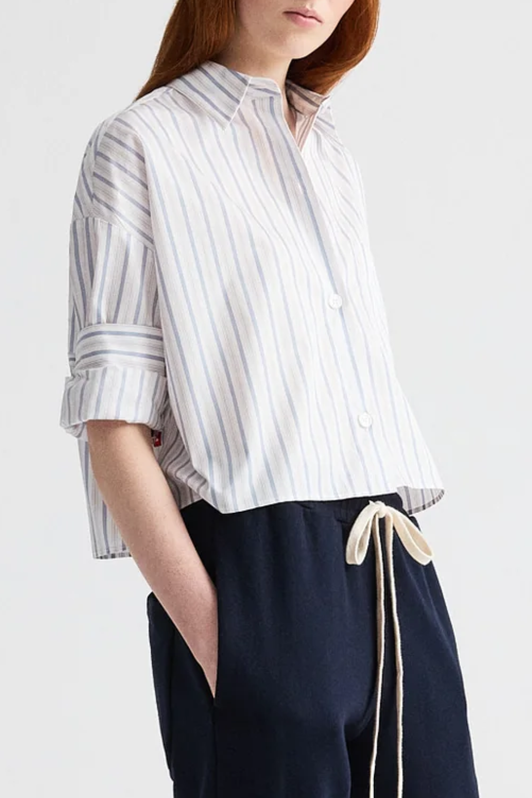 Cropped, short sleeved button down in superfine italian cotton shirting with mini awning stripe. The Next Ex is a boxy silhouette. Complete with a chest patch pocket, button up placket, spread collar, and TWP's signature double roll button cuffs.