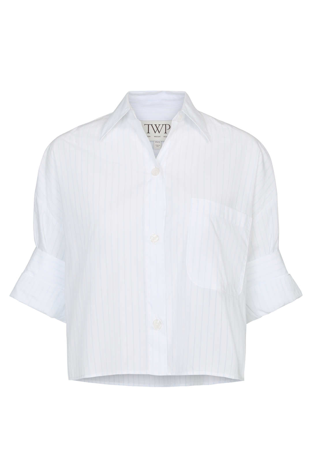 Cropped short-sleeve button-down in fine drop-needle shirting. The Next Ex is a boxy silhouette. Complete with a chest patch pocket, button-up placket, spread collar, and signature double roll button cuffs.