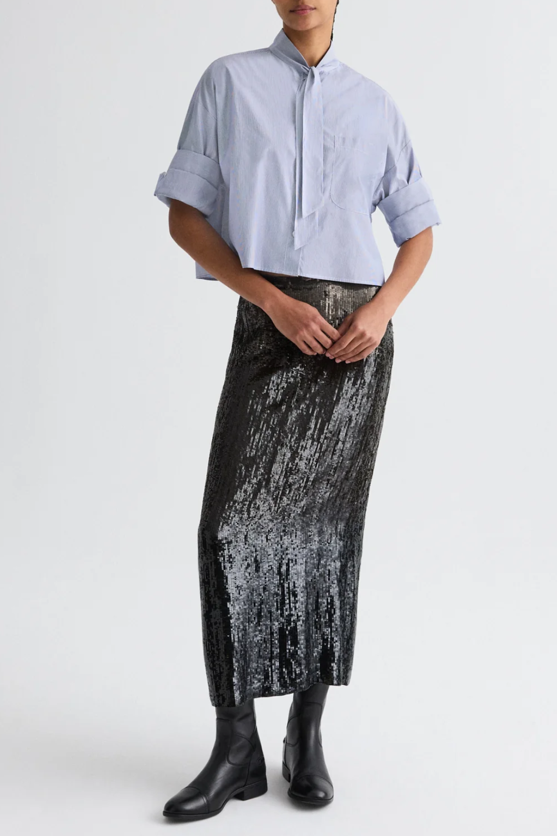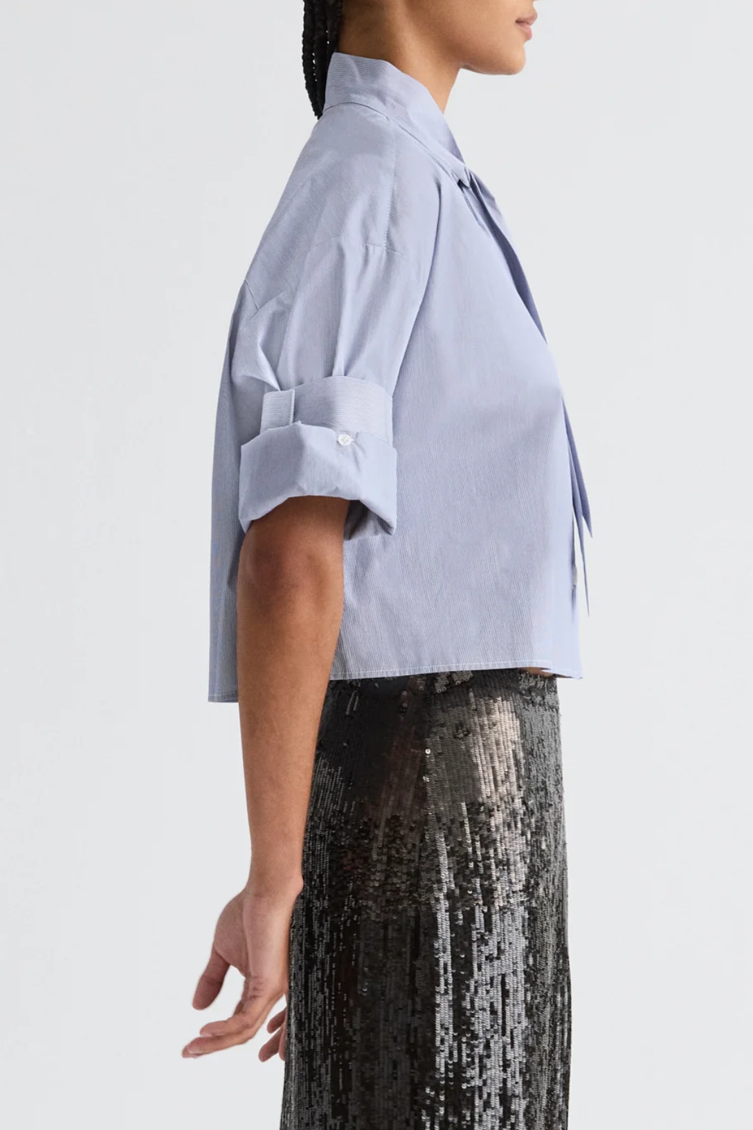 Cropped, short sleeved button down in ultra-finely striped Italian cotton shirting, with a neck tie at the collar. The Next Ex is a cropped, boxy silhouette. Complete with a chest patch pocket, button up placket, spread collar, and TWP's signature double roll button cuffs.