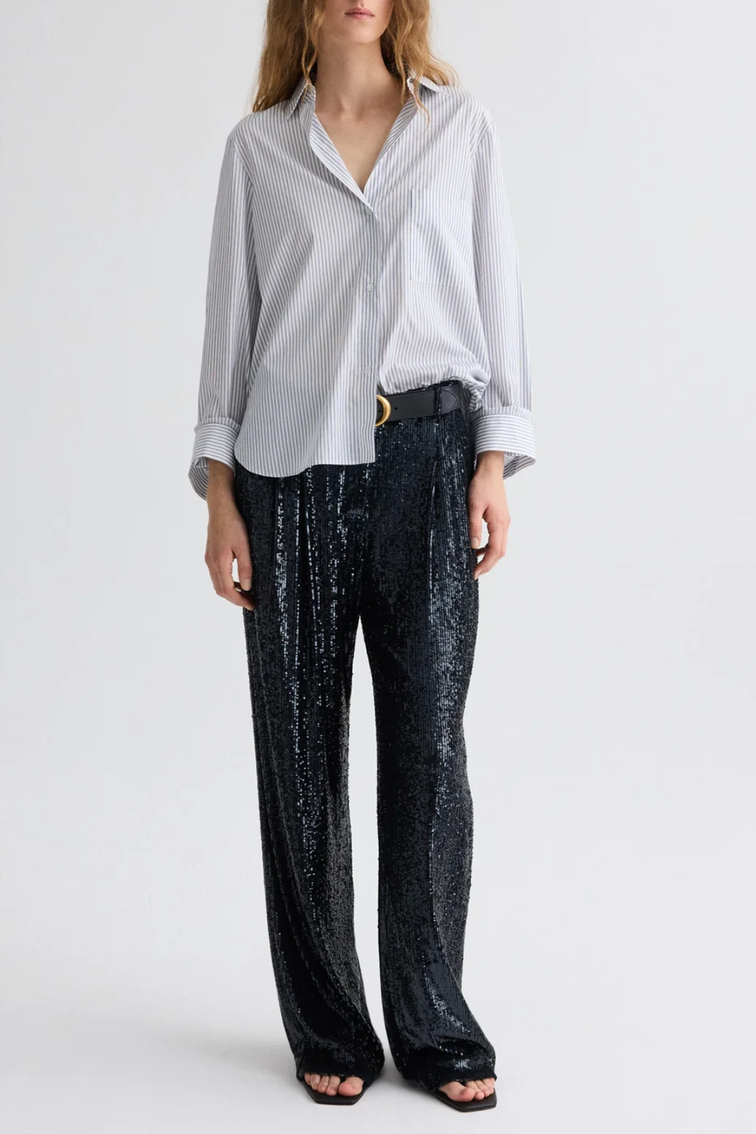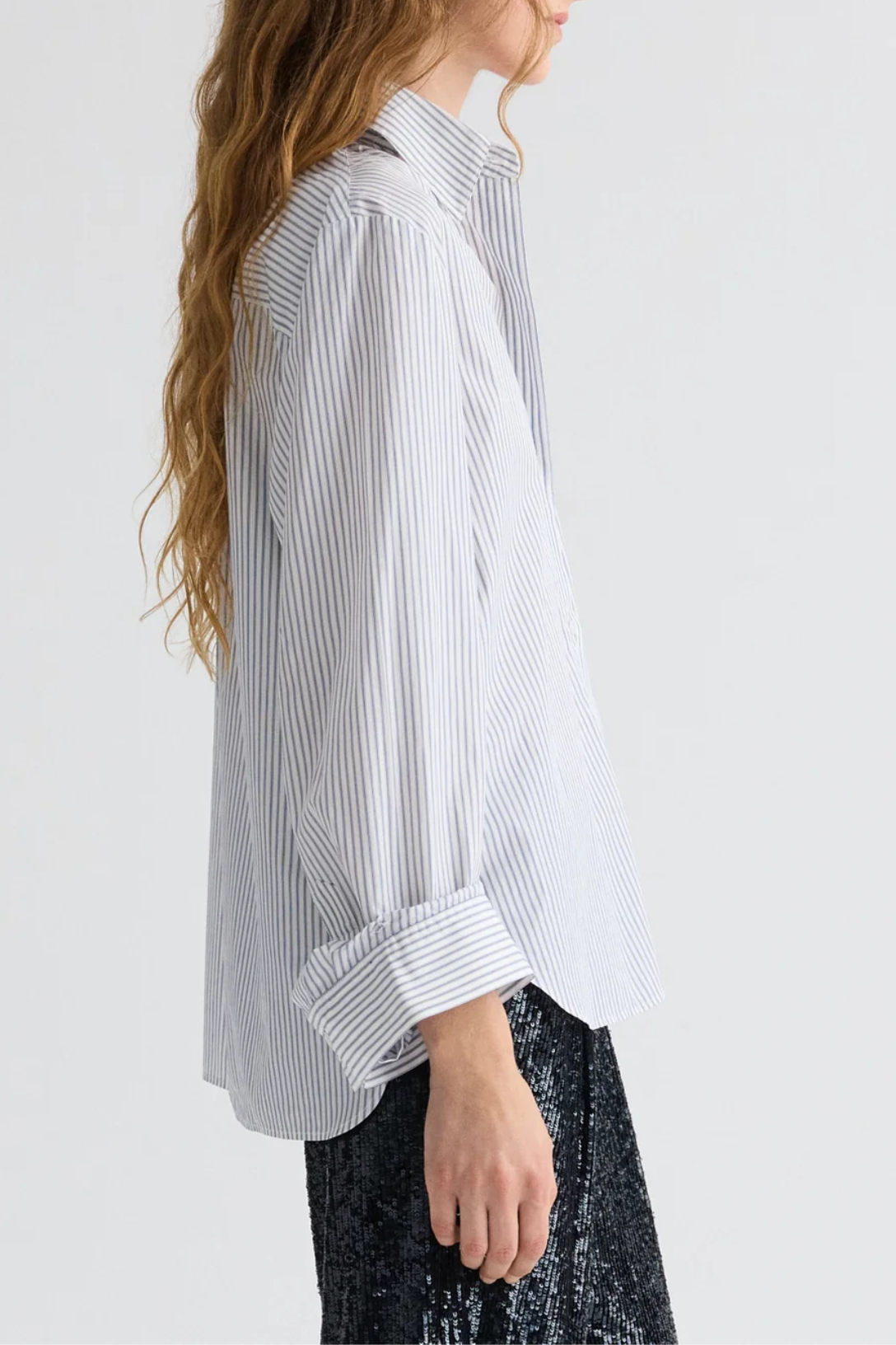 Oversized button down shirt in micro hairline stripe. The Next Morning is a relaxed silhouette with a center box pleat at the back. Complete with an exposed button up placket, chest patch pocket, spread collar and single roll button cuffs.