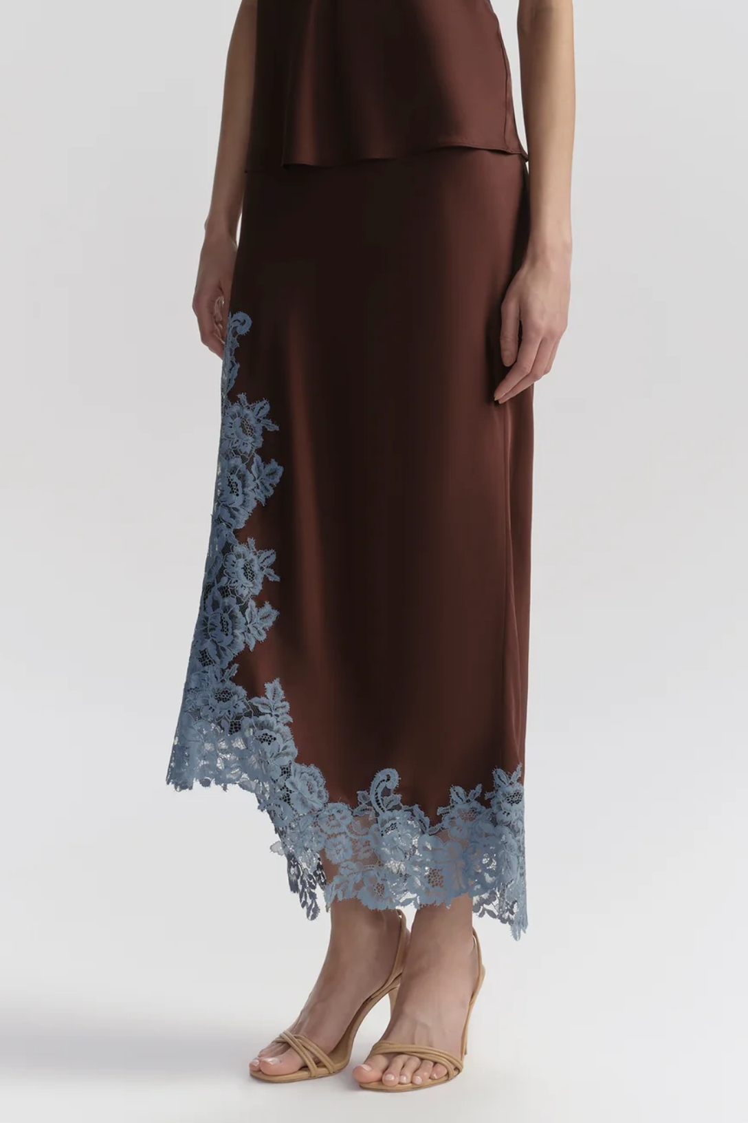 The Olivia Skirt is crafted from fluid viscose with a soft drape and subtle sheen in a deep ganache hue. This midi silhouette features contrasting French blue lace inserts along the hem.
