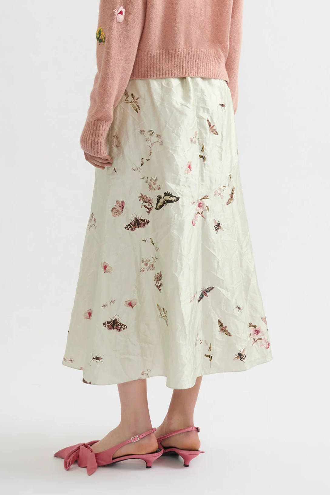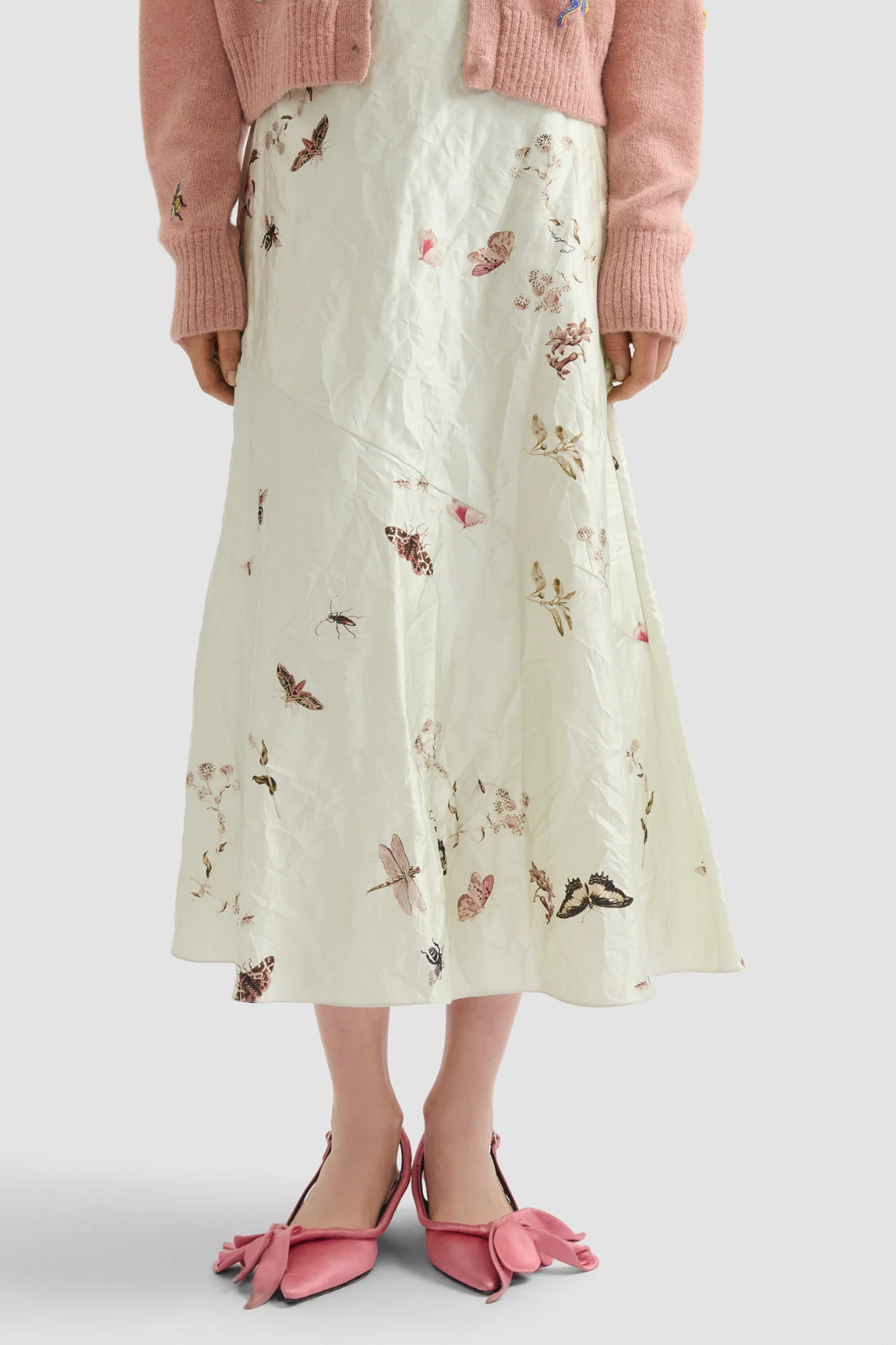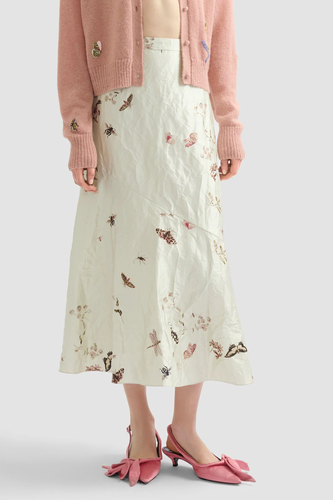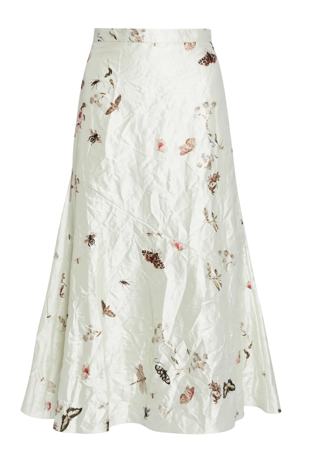 This relaxed A-line skirt is made from white textured satin which is decorated with a print inspired by German naturalist, Maria Sibylla Merian. An array of butterflies, bugs and small flowers, are unevenly scattered across the fabric.