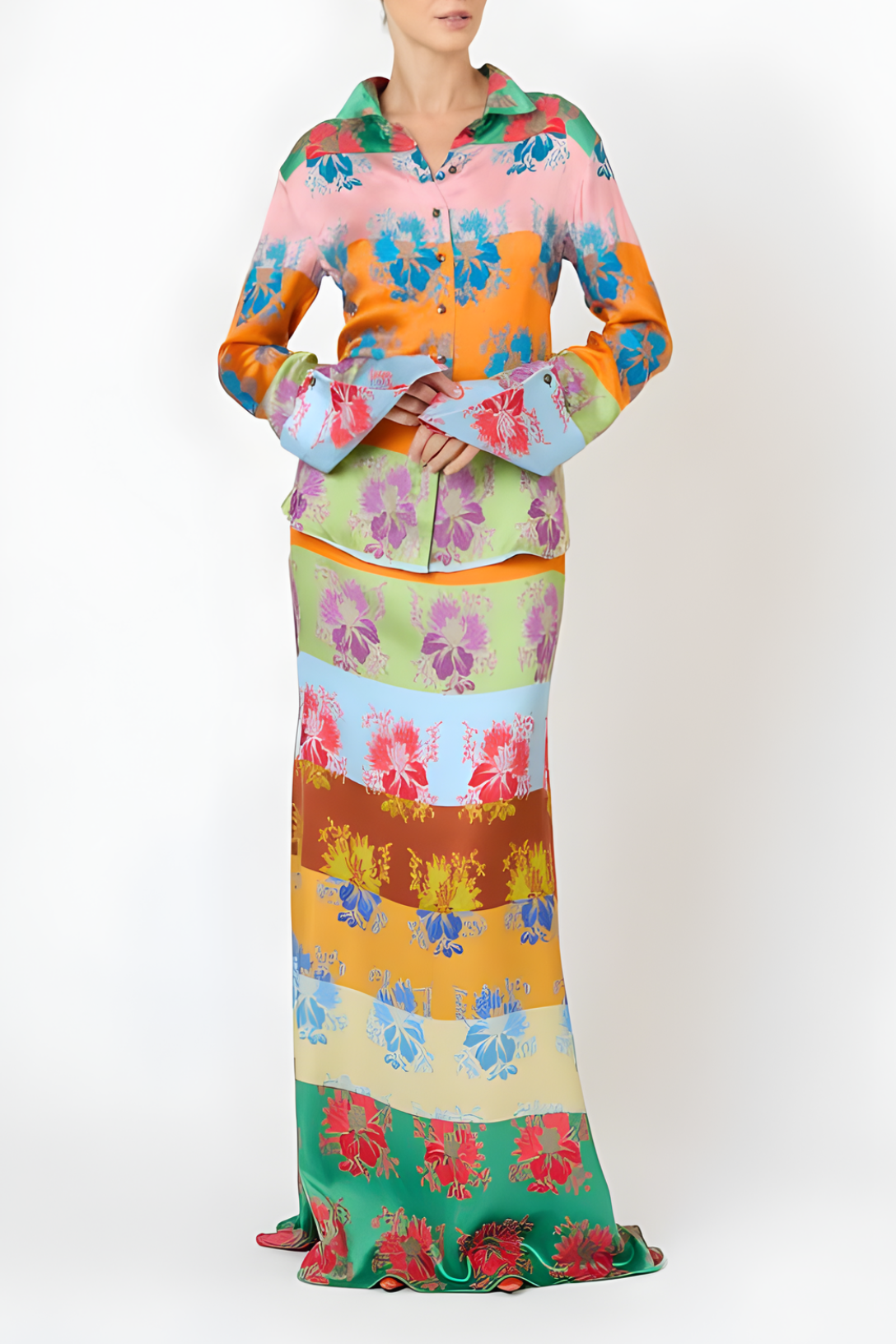 The silhouette skims the hips before flaring gently toward the hem, allowing the fabric to ripple and pool with ease. Long, expressive, and unmistakably joyful, it is designed for high summer moments that call for drama, color, and motion without excess.