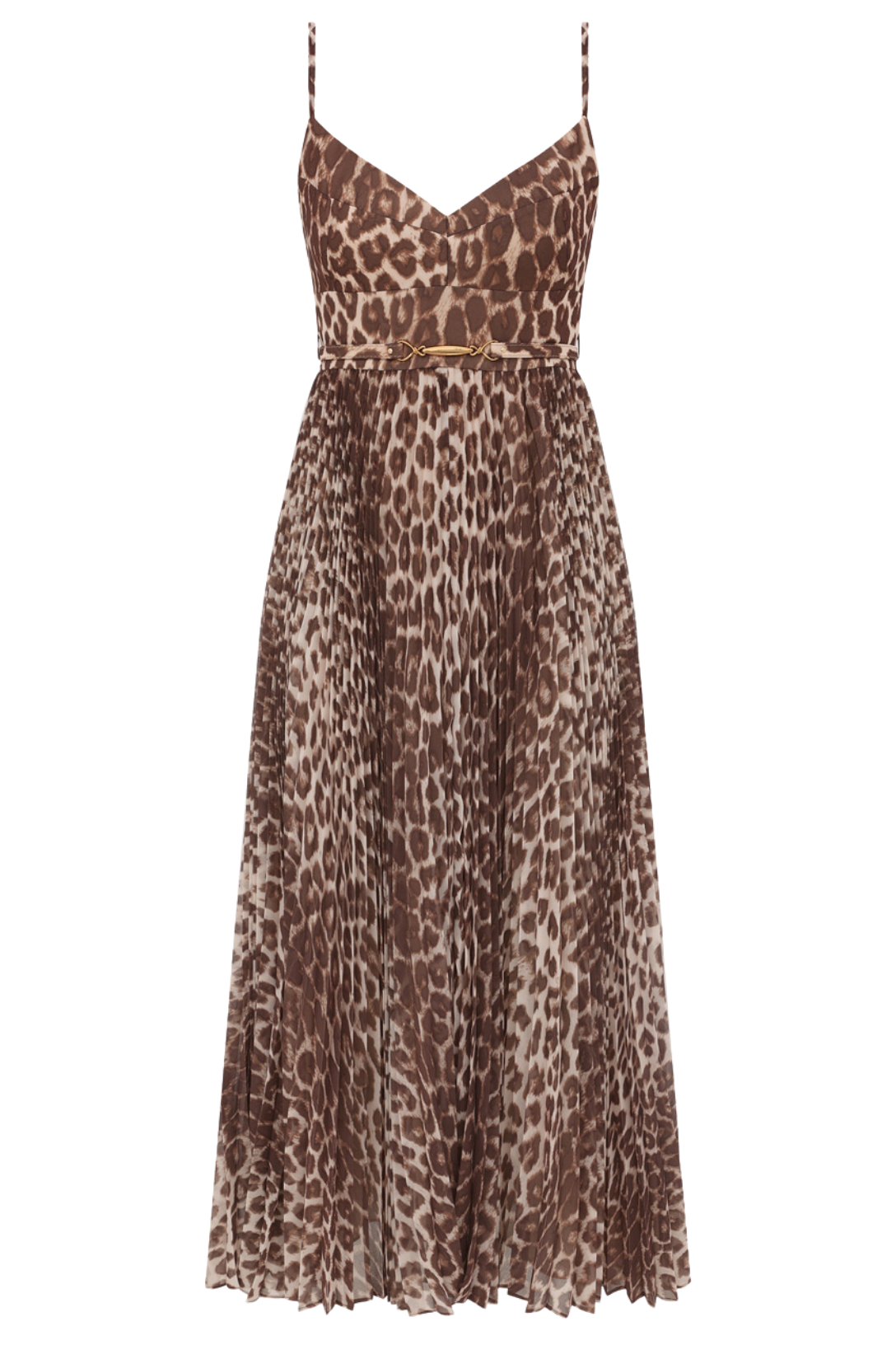 The Sunray Pleated Picnic Dress in Leopard from Zimmermann's Spring 2026 Collection, Kindred Spirit. A midi dress featuring a deep V-neckline, fitted waistband, finished with a center back invisible zip and heavily pleated skirt.