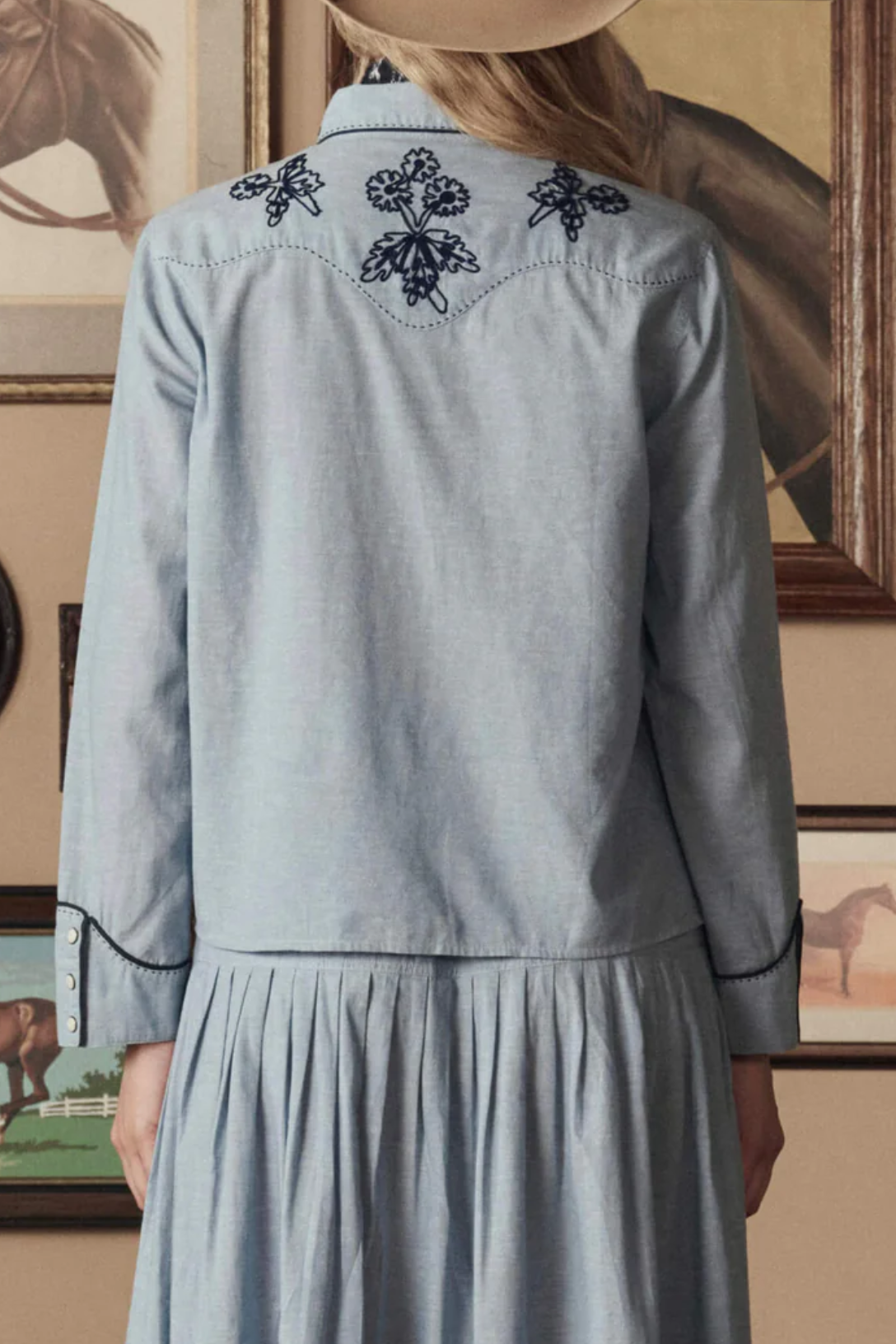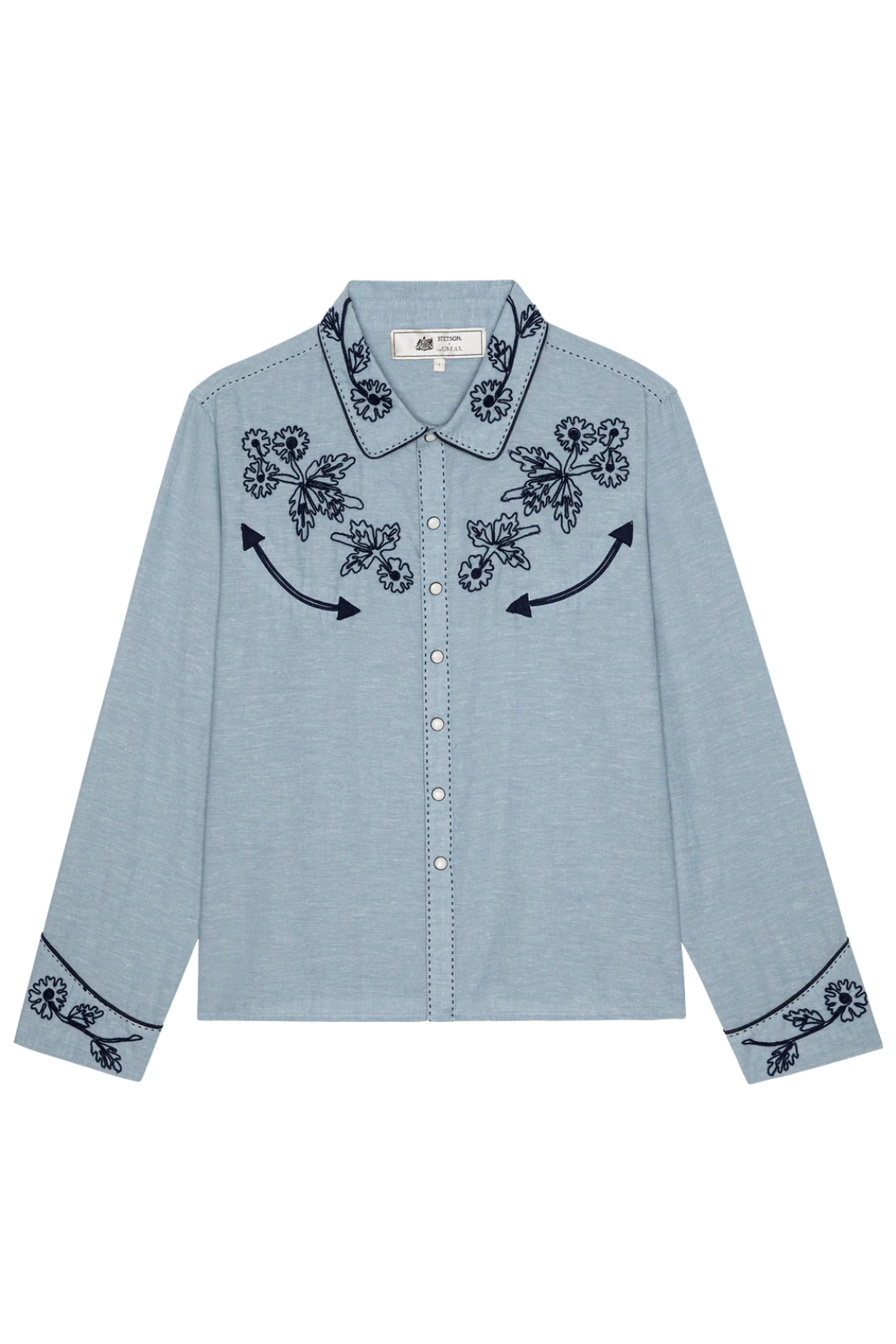 Made in collaboration with Stetson, whose legacy of authentic craftsmanship has defined the spirit of the West since 1865, the Chambray Embroidered Western Shirt channels the charm of a treasured 1940s rodeo find. Cut from lightweight chambray with a soft denim feel, the shirt is detailed with dark navy Western floral embroidery and piped finishes that frame the silhouette. Classic Western chest pockets add a nostalgic, heritage-inspired touch. The fit is boxy and relaxed, balanced by tailored elements like a crisp shirt collar and traditional Western sleeve cuffs that bring structure to the easy shape.
