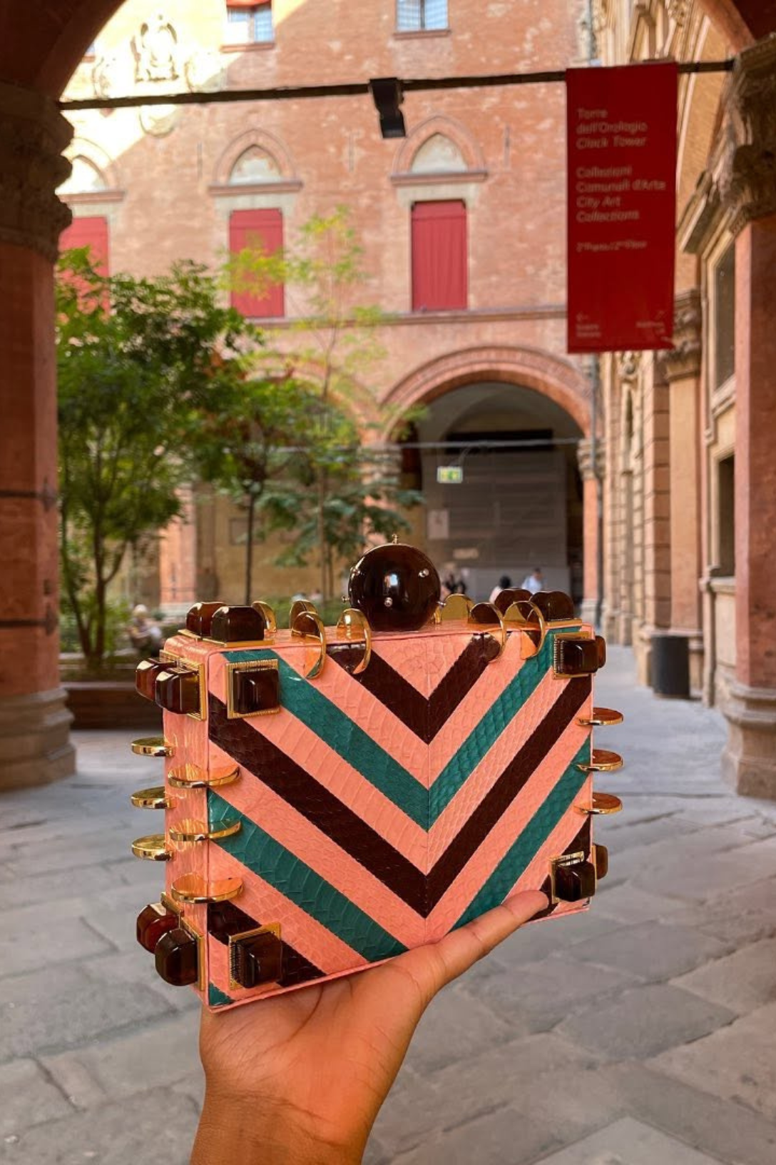 This exceptional pale pink box clutch is a harmonious fusion of luxury and modern style.