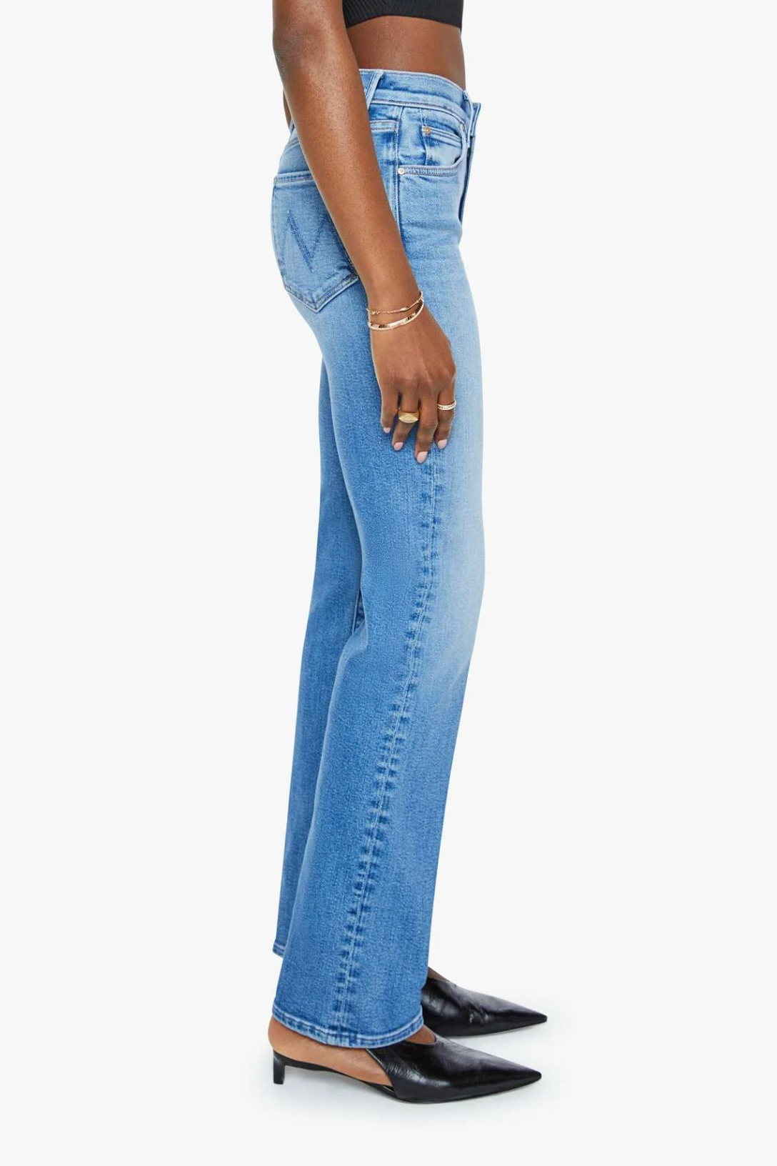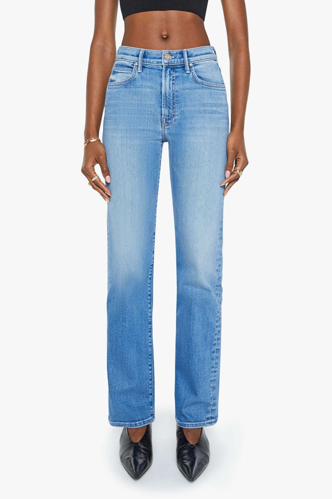 Crowd pleaser. A high-rise straight leg jean with a 32-inch inseam and a clean hem. Cut from stretch denim, Fan Favorite is a mid-blue with whiskering and fading at the knee.