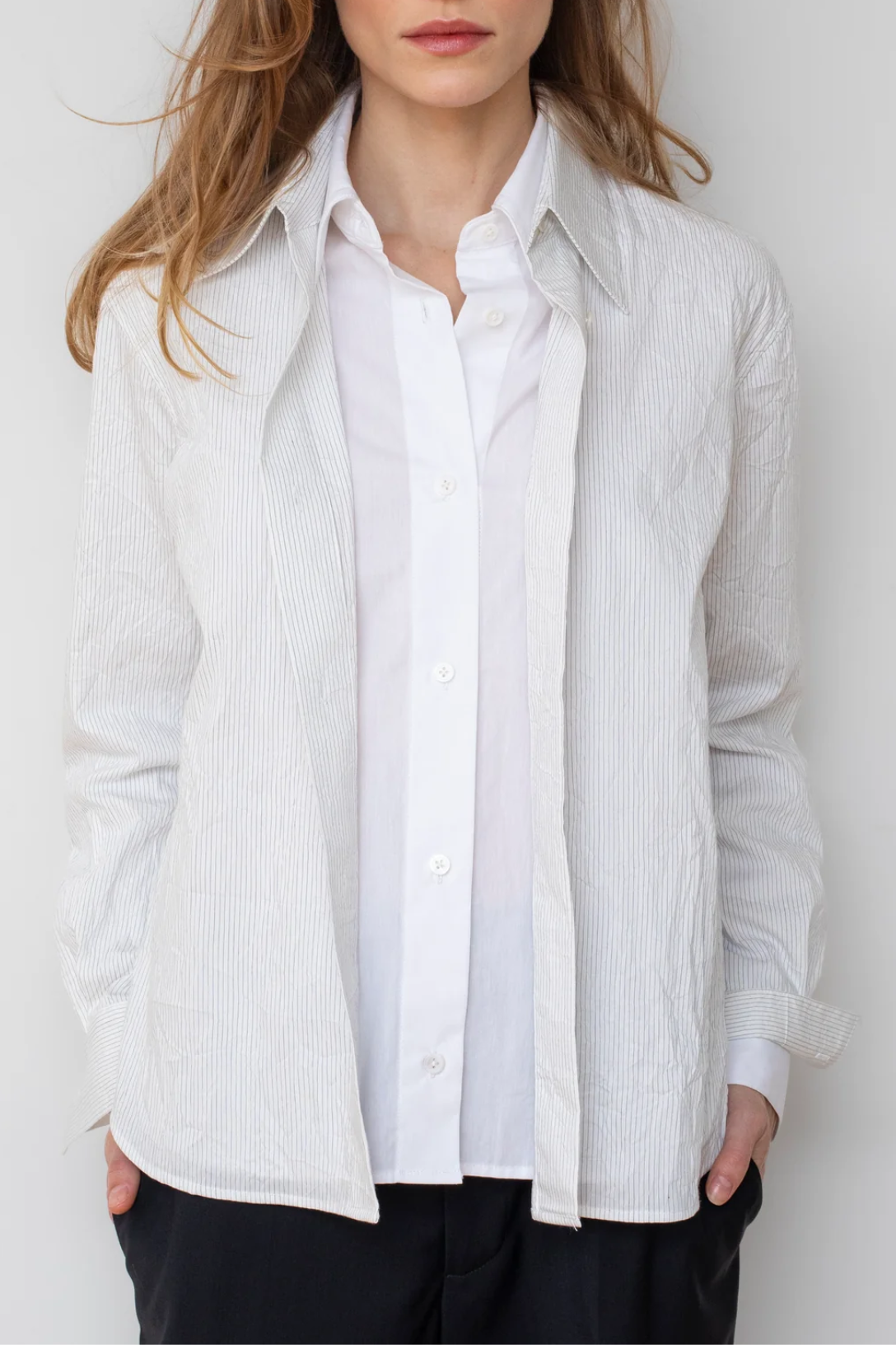 Redefining the art of dimension, The Layered Shirt is an elevated take on the quintessential button-down. Reconstructed from luxury deadstock poplin, the design pairs a traditional pinstripe exterior with a crisp white inner layer for a flawless, two-in-one silhouette. With its signature double collars and cuffs, it is a statement of effortless precision and sustainable craftsmanship.