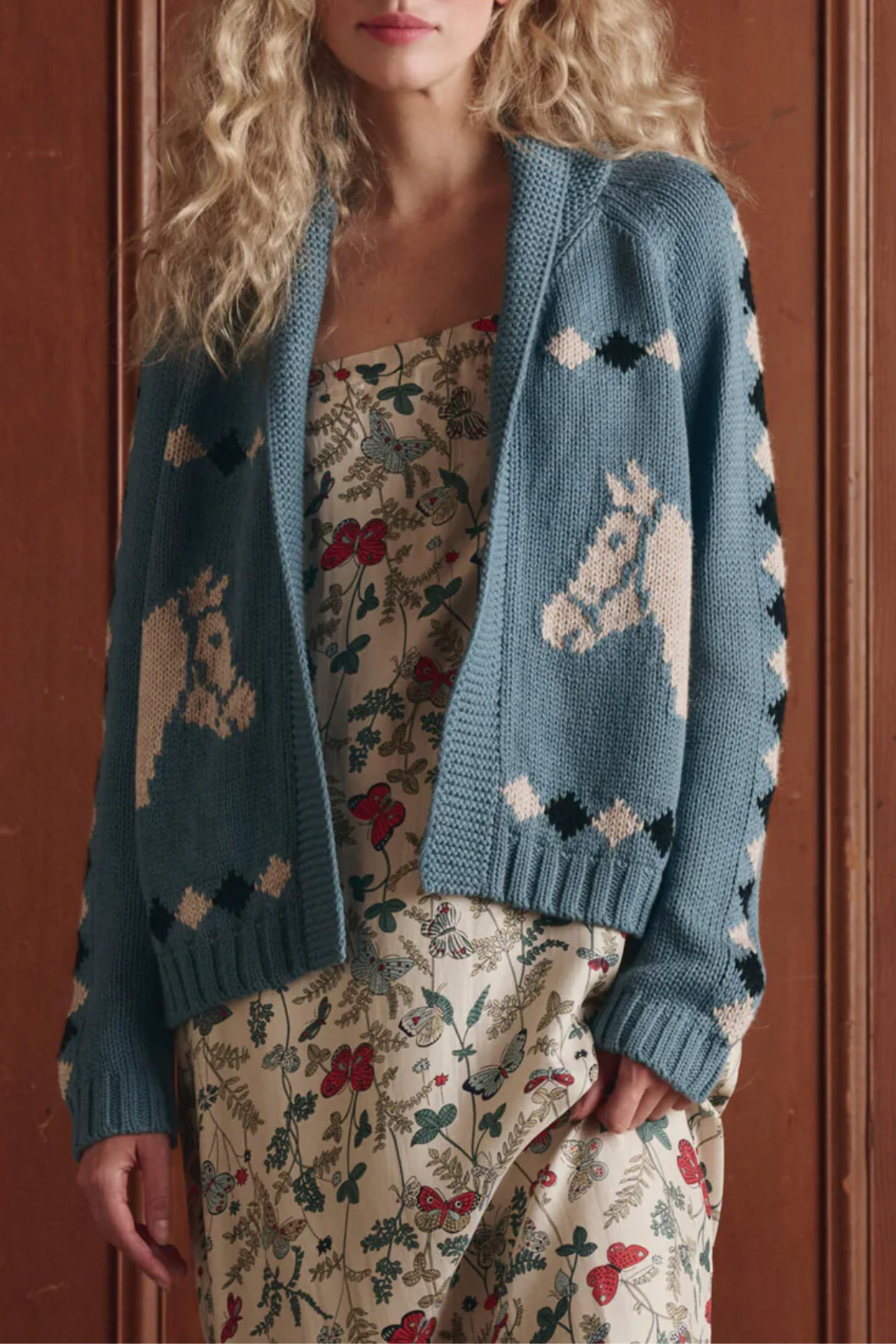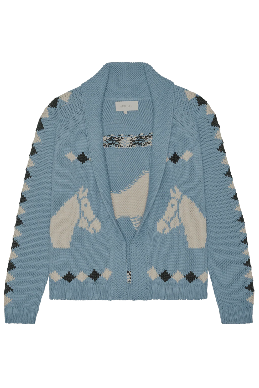 A reimagined version of THE GREAT's signature Lodge Cardigan, the Stable Lodge Cardigan features a western horse motif—a playful detail inspired by a 1960s children’s sweater. Spun from a soft cotton/alpaca yarn, it’s cozy, comfortable, and full of character. Designed for intentional ease throughout the body. Size down for a smaller fit.
