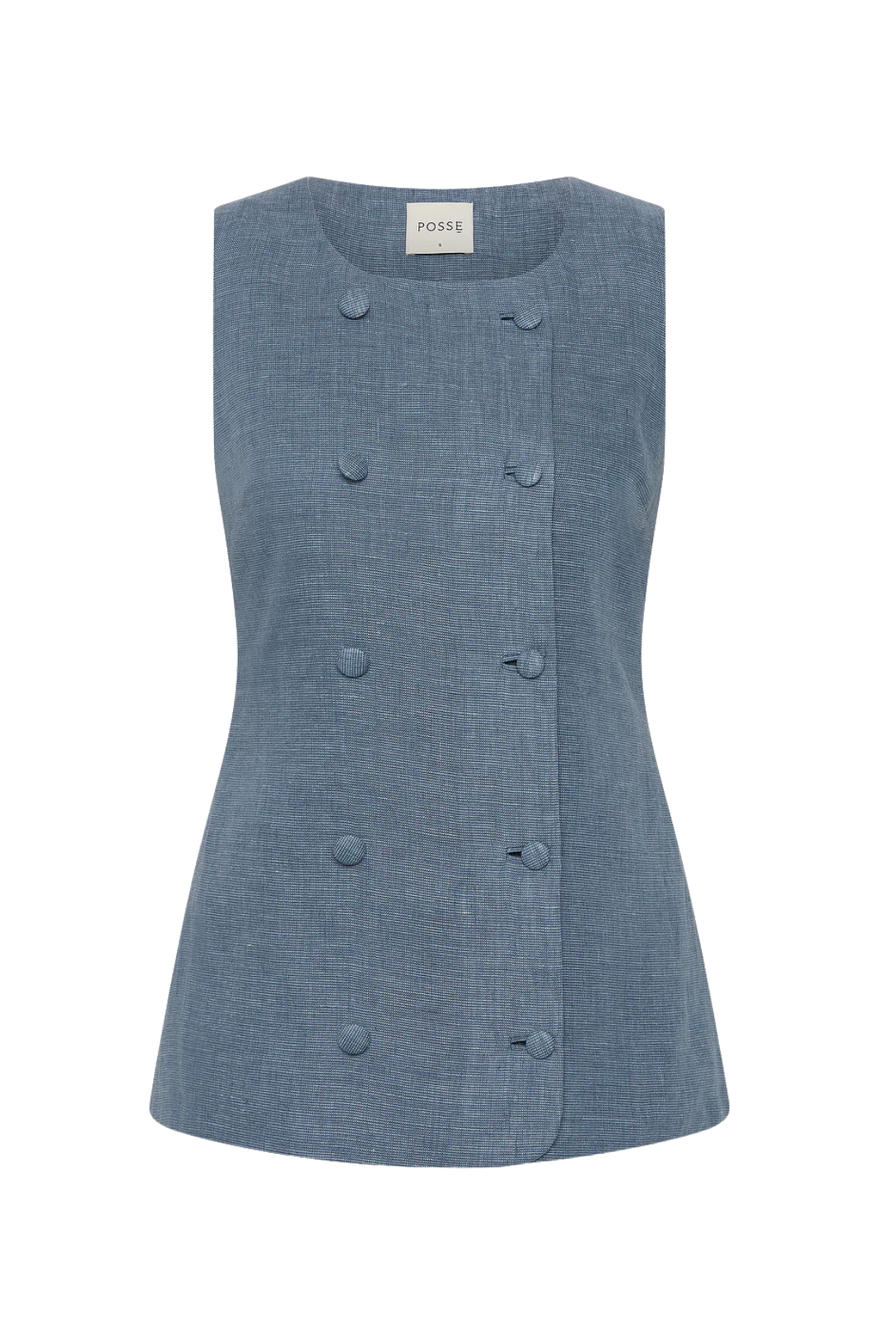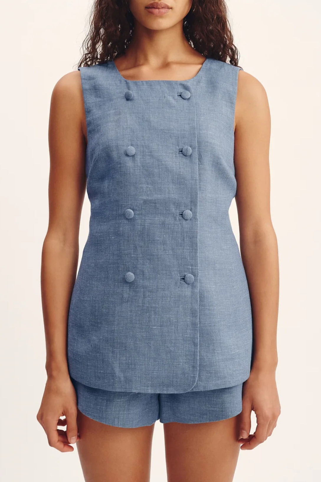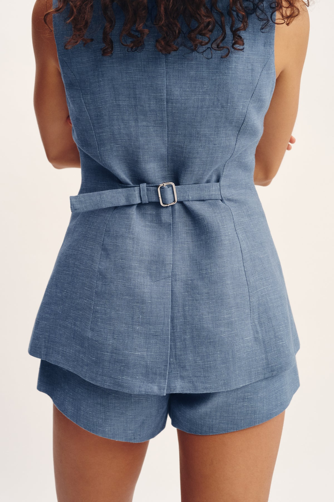 Crafted from premium linen, the Thea Vest features a double breasted button fastening, high scoop neckline, and an adjustable buckle fastening at the back.