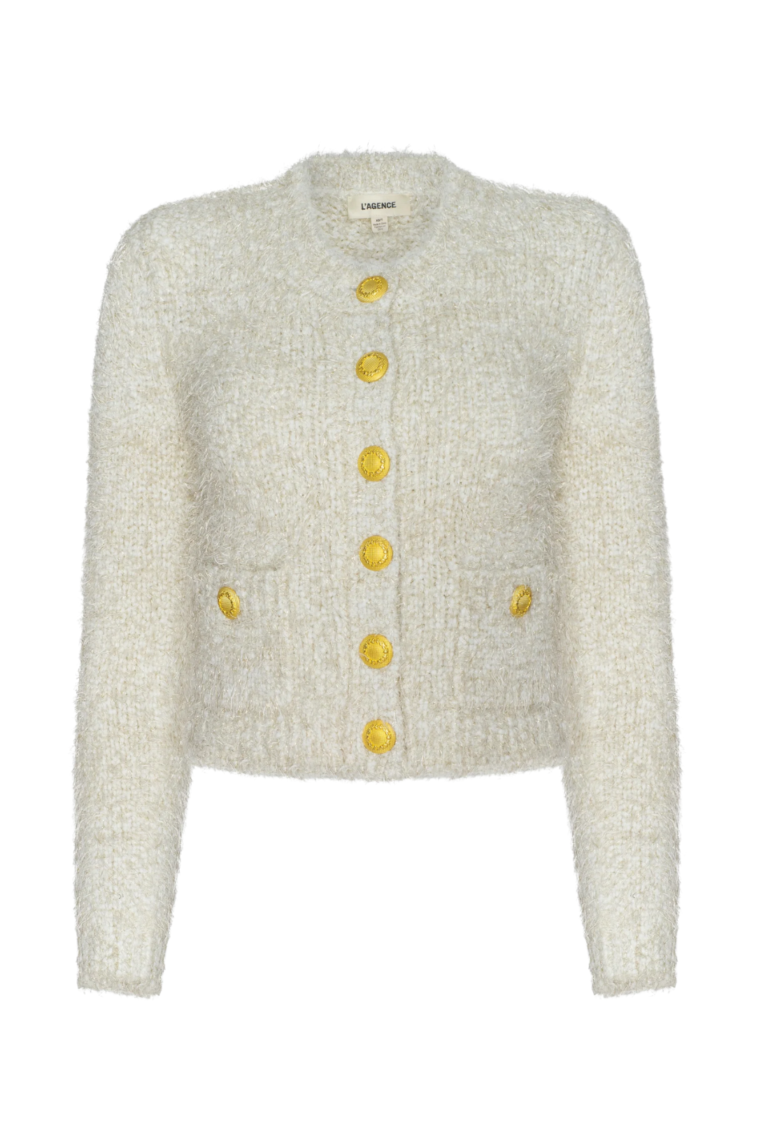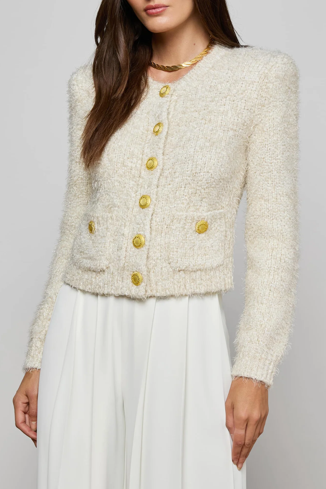 The Una cardigan blends texture and structure in a tailored silhouette. Designed in a soft eyelash knit, it features bold gold buttons, patch pockets, and a round neckline for a polished finish. Its metallic yarns add dimension and depth, perfect for pairing with denim or layered over sleek basics. Wear it as a top or second layer all season long. Now in white with subtle gold threads.
